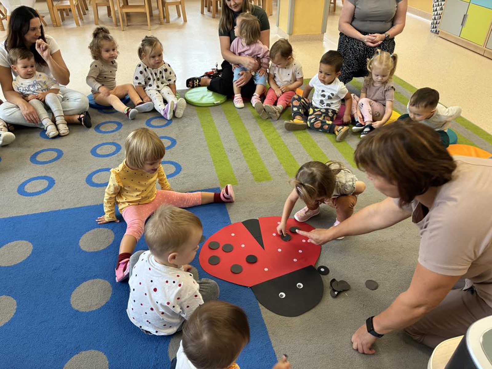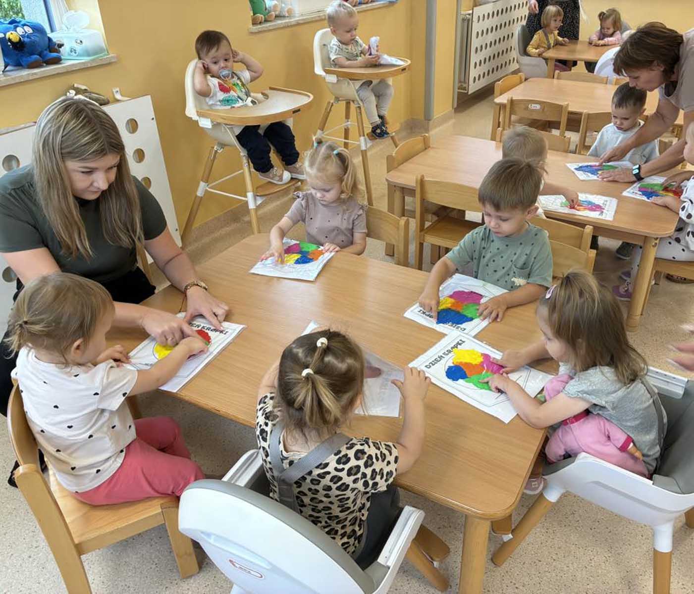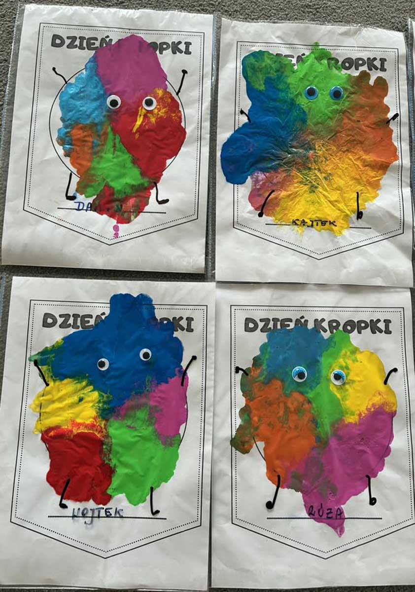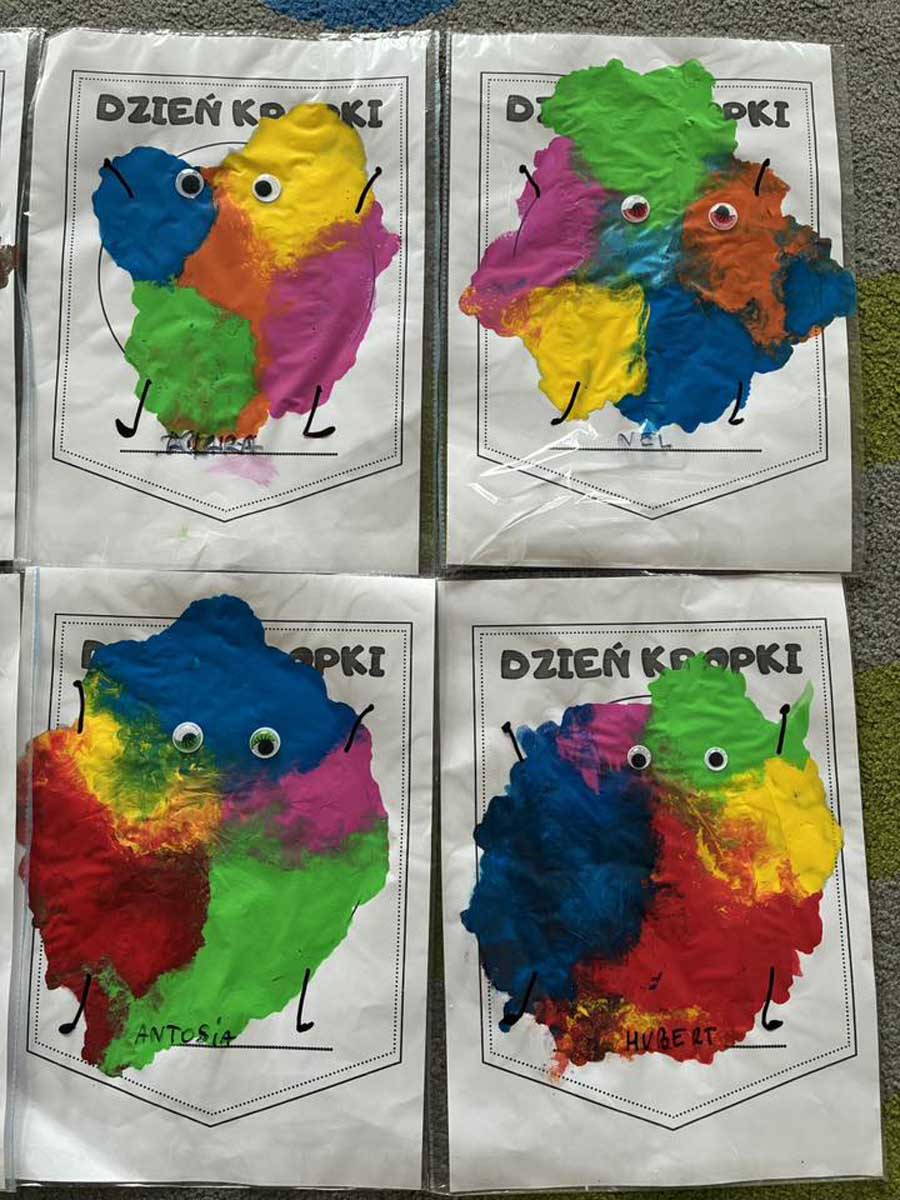 „Dzień Kropki” był świętem odwagi, kreatywności i zabawy, który świętowaliśmy z wielką radością. Z tej okazji dzieci przyszły ubrane w kropkowe stroje i brały udział w wielu atrakcjach. Tworzyły kolorowe kropki w niebrudzący sposób, dzięki czemu stymulowały zmysł dotyku i wzroku. Następnie układały kropki na sylwecie biedronki, ćwicząc motorykę małą. Nie zabrakło też zabaw muzyczno - ruchowych, a na zakończenie każde dziecko otrzymało dyplom. Był to bardzo barwnie, wesoło i twórczo spędzony czas.