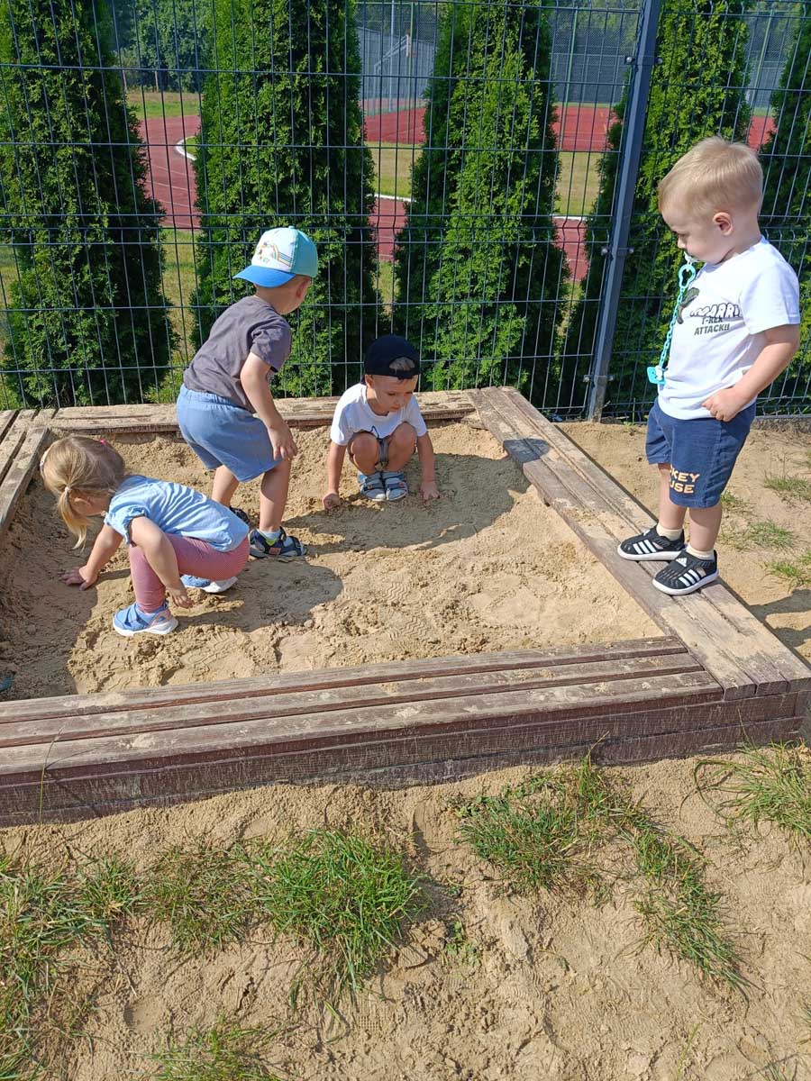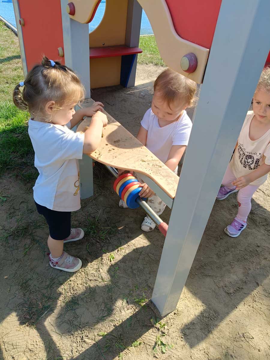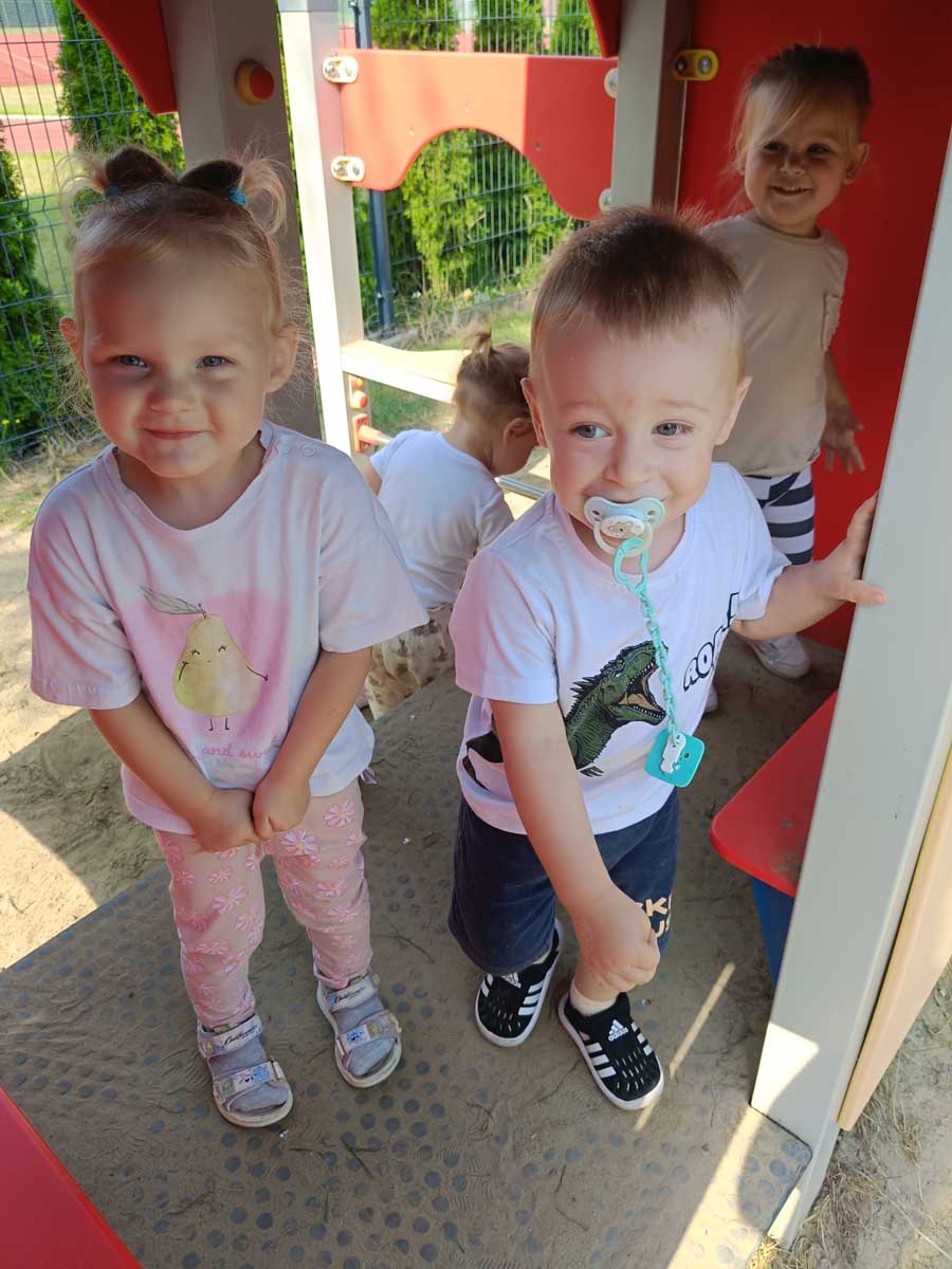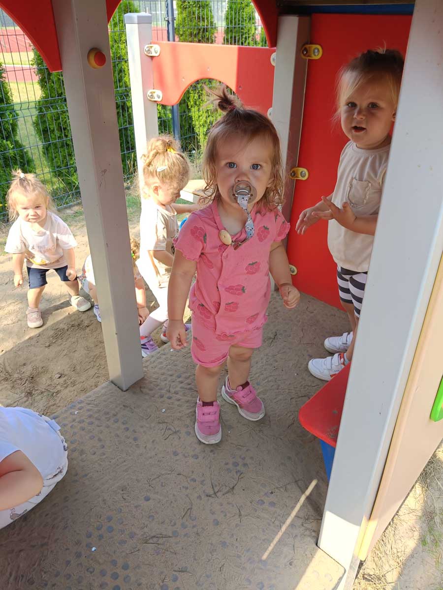 Maluszki aktywnie spędzały czas w salach żłobkowych, na żłobkowym placu zabaw oraz poznając otoczenie żłobka w czasie spacerów. „Słoneczka” bawiły się podczas realizacji tematów tygodniowych: