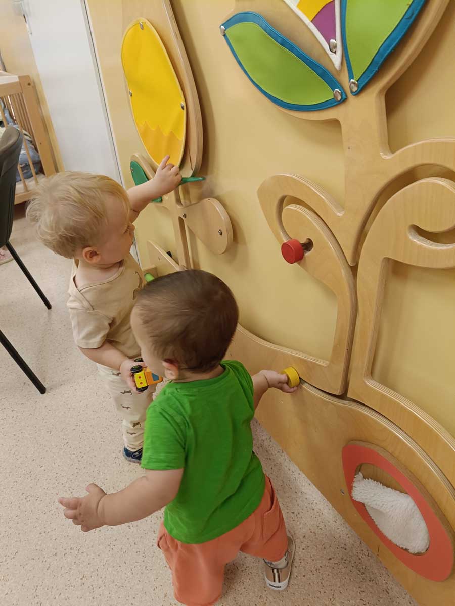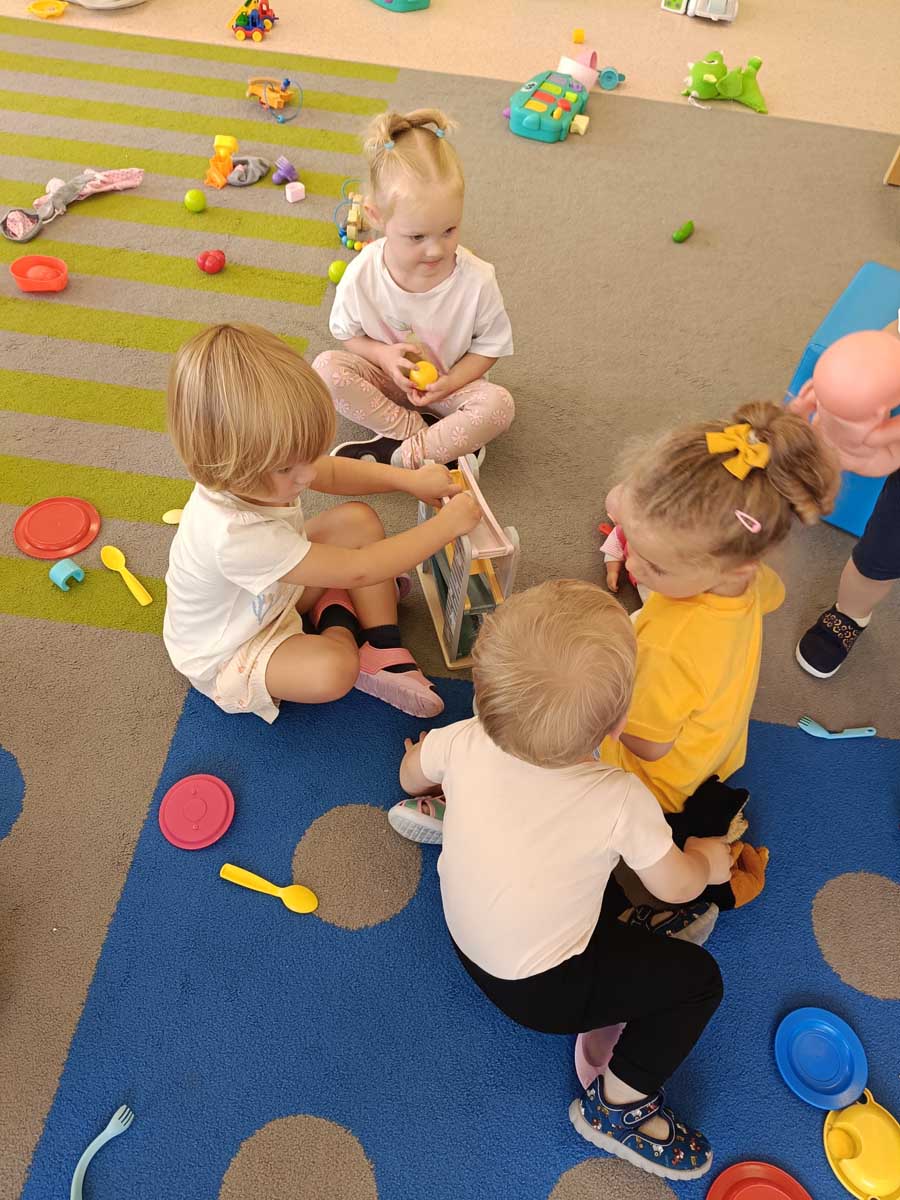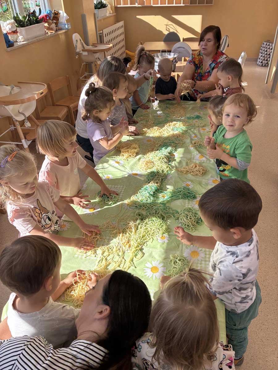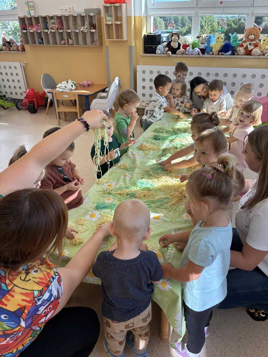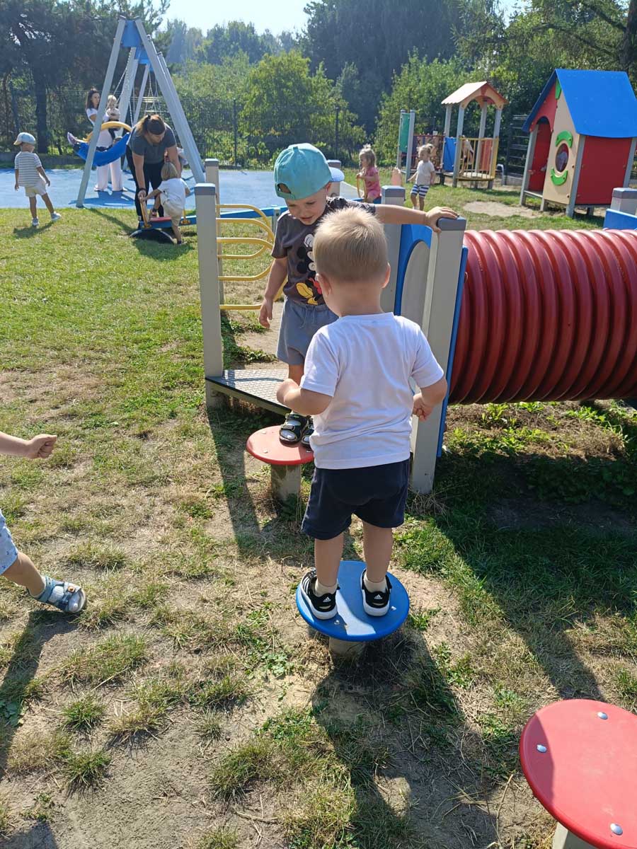 Maluszki aktywnie spędzały czas w salach żłobkowych, na żłobkowym placu zabaw oraz poznając otoczenie żłobka w czasie spacerów. „Słoneczka” bawiły się podczas realizacji tematów tygodniowych: