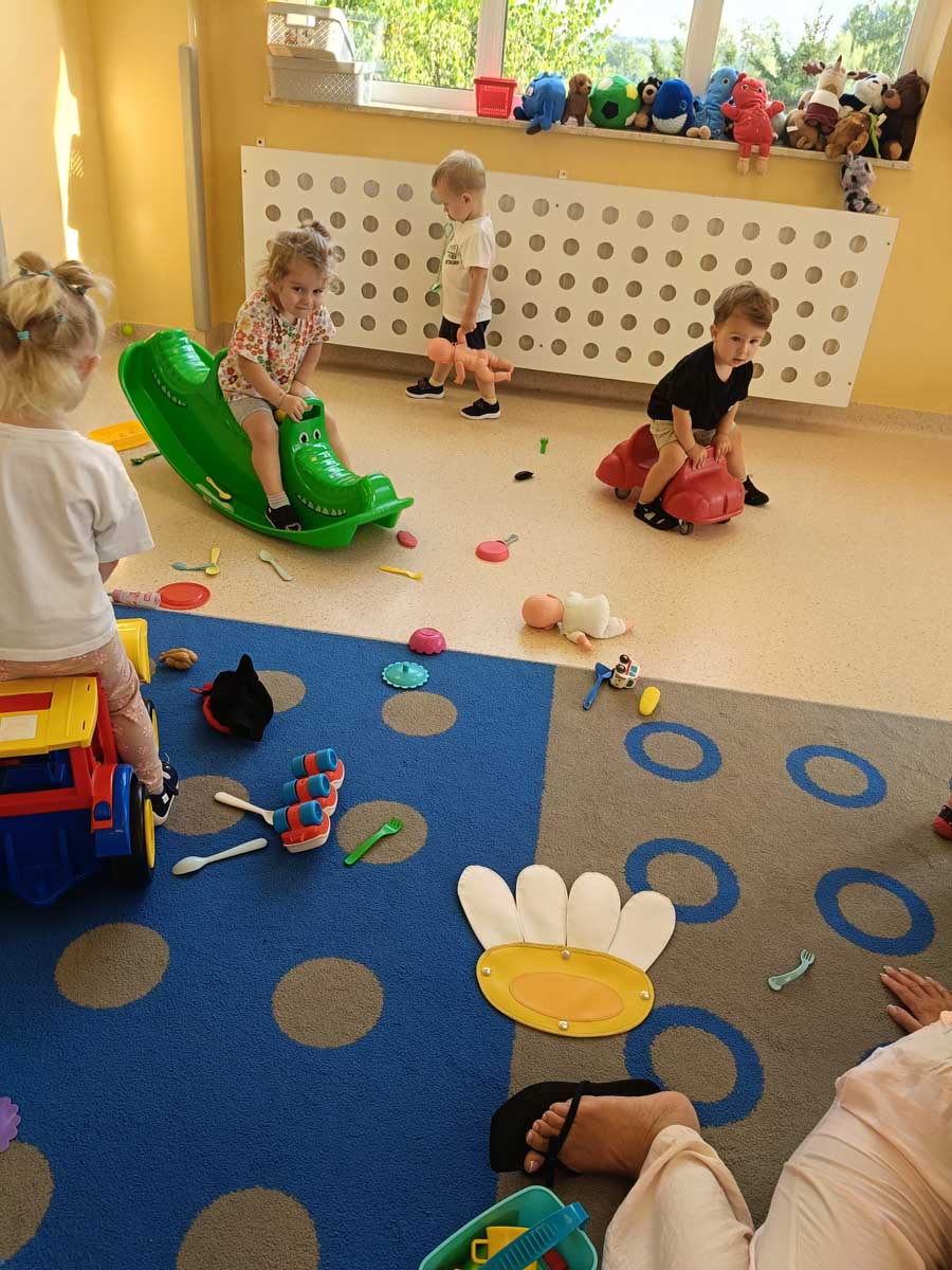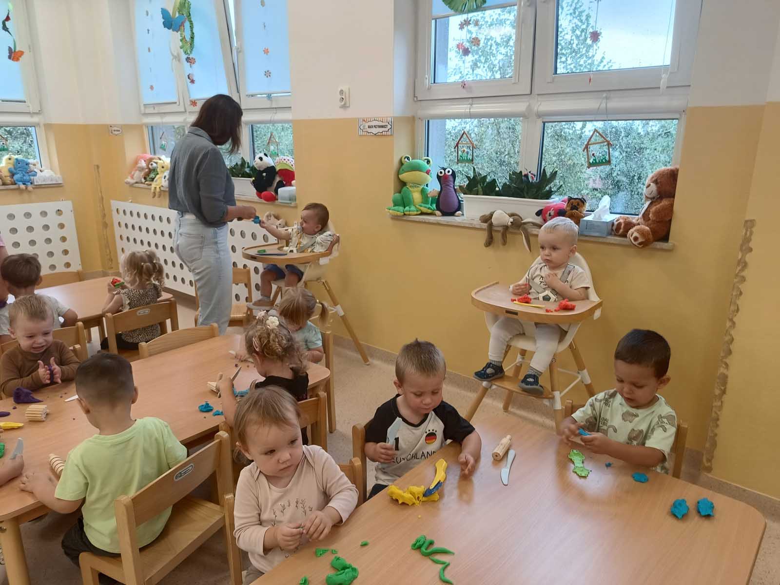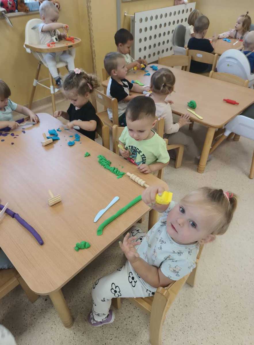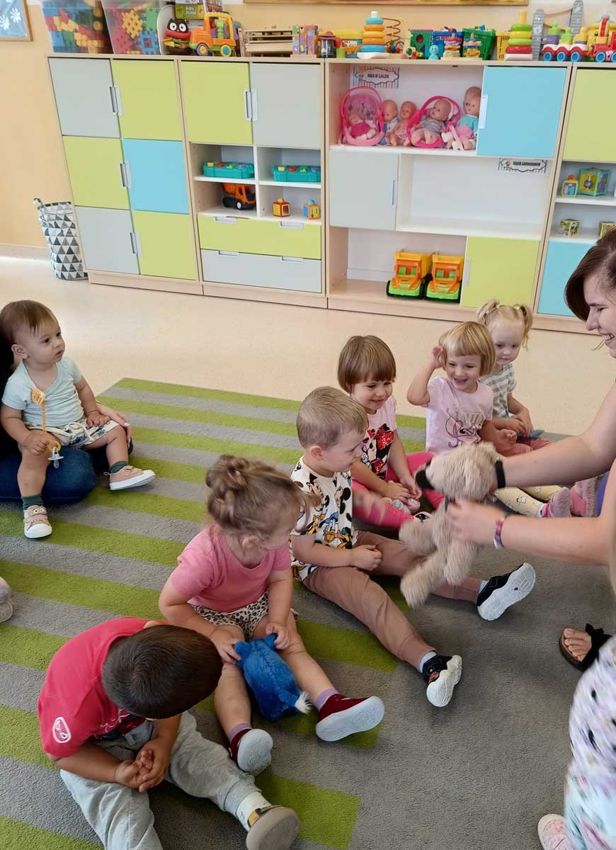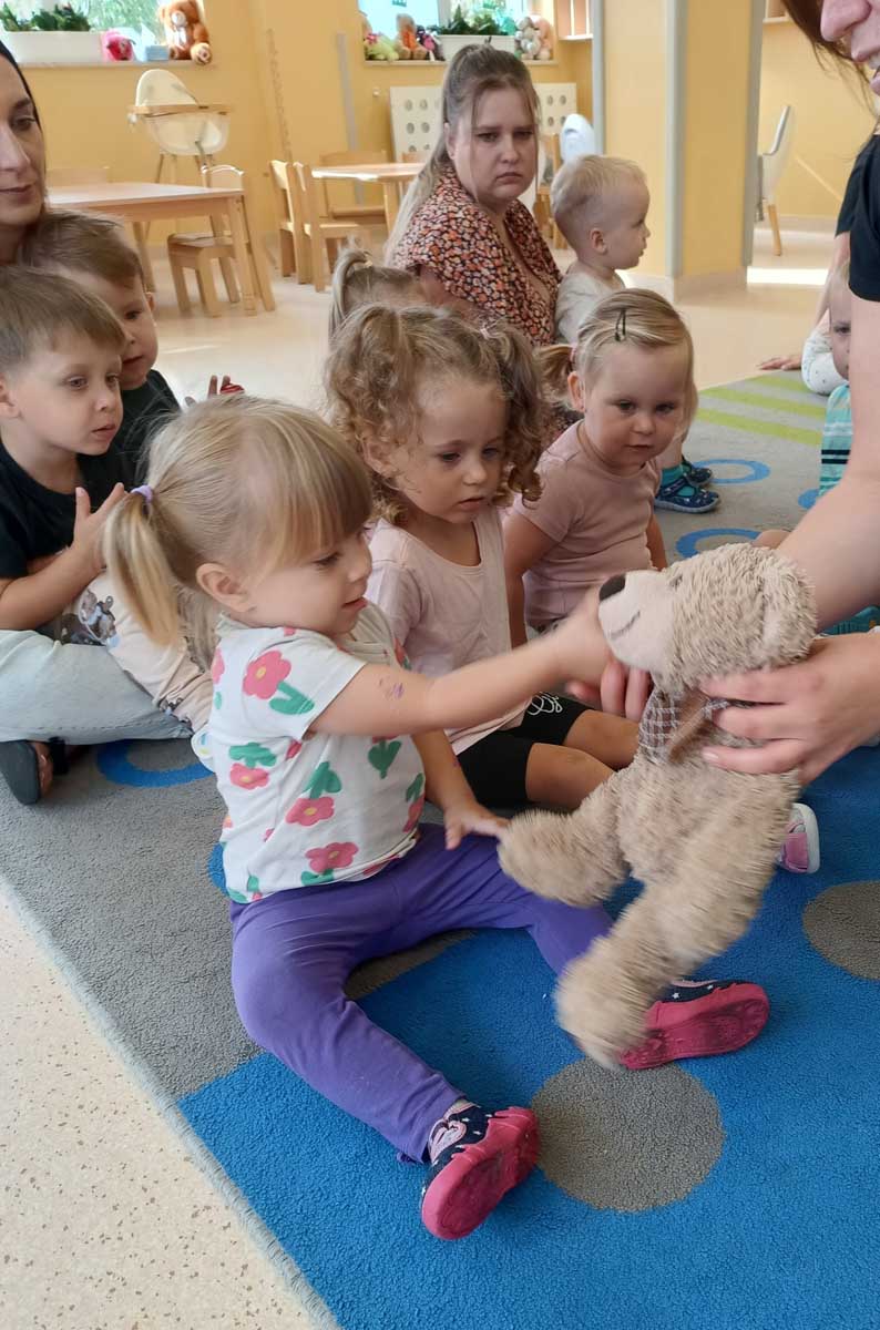 Dzieci uczestniczyły w zabawach integracyjnych z misiem Tedym i z piłką oraz przy muzyce umożliwiających poznanie imion koleżanek, kolegów oraz opiekunek. Zapoznały się z zasadami obowiązującymi w żłobku oraz na placu zabaw i podczas spacerów. Wykonywały ćwiczenia gimnastyczne, uczestniczyły w zabawach orientacyjno - porządkowych i muzyczno - ruchowych kształtujących ramiona i nogi oraz ogólną sprawność fizyczną. Rozwijały główne grupy mięśniowe, poczucie rytmu, umiejętność poruszania się po sali bez potrącania innych dzieci podczas zabaw rytmicznych na postawie publikacji „Tuptaj maluszku” autorstwa M. Konarskiego. Maluszki ćwiczyły też koordynację wzrokowo - ruchową bawiąc się pomponami, kropkami i kasztanami oraz usprawniały małą motorykę wykorzystując bibułę i podczas zabaw paluszkowych. Tworzyły prace plastyczne, plastyczno - sensoryczne oraz bawiły się sensorycznie wykorzystując ciastolinę, farby i makaron. Wspomagały aparat mowy wykonując ćwiczenia oddechowe i logopedyczne, jak również uczestniczyły w zabawach matematycznych kształtując umiejętności klasyfikowania według jednej cechy. Maluchy rozwijały także umiejętność manipulowania, zręczności i zachowania równowagi podczas zabaw konstrukcyjno - manipulacyjnych z wykorzystaniem różnego rodzaju klocków.