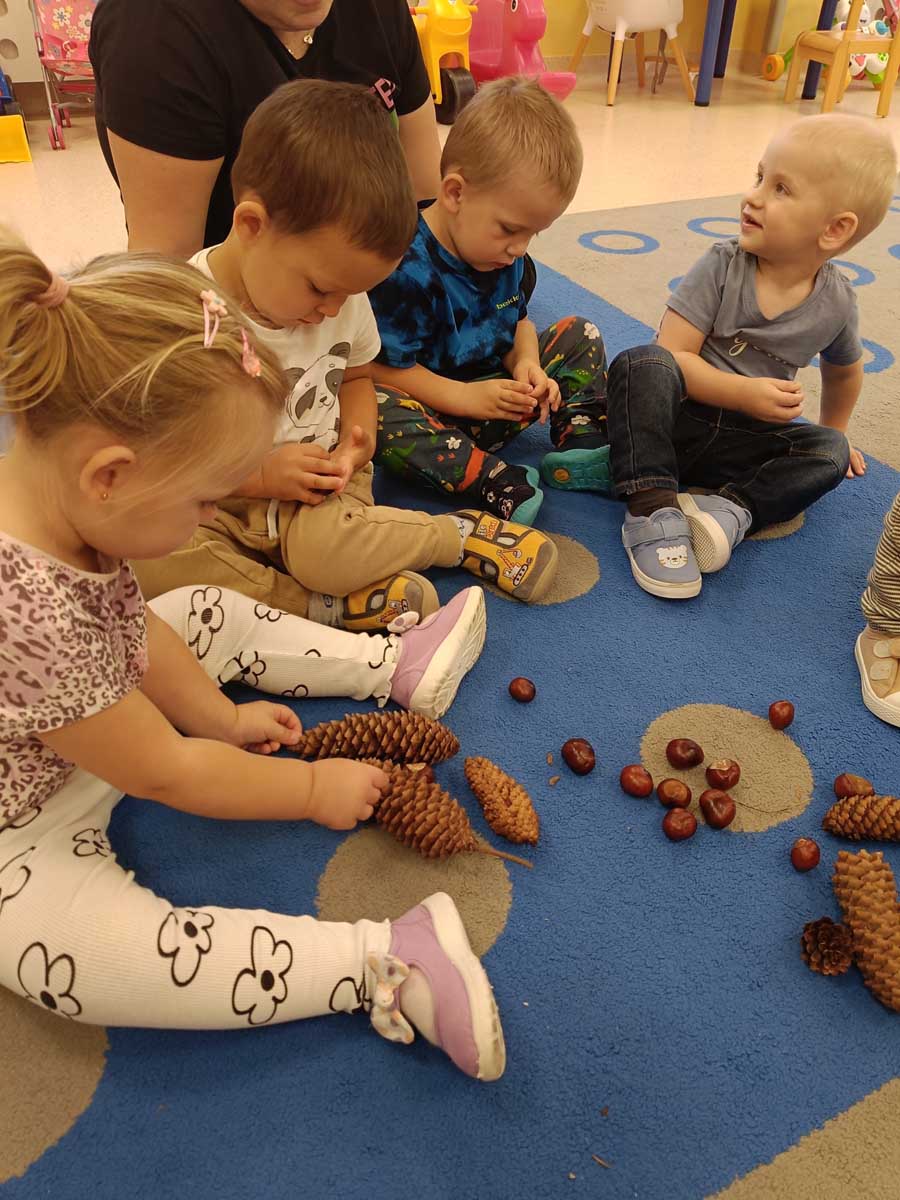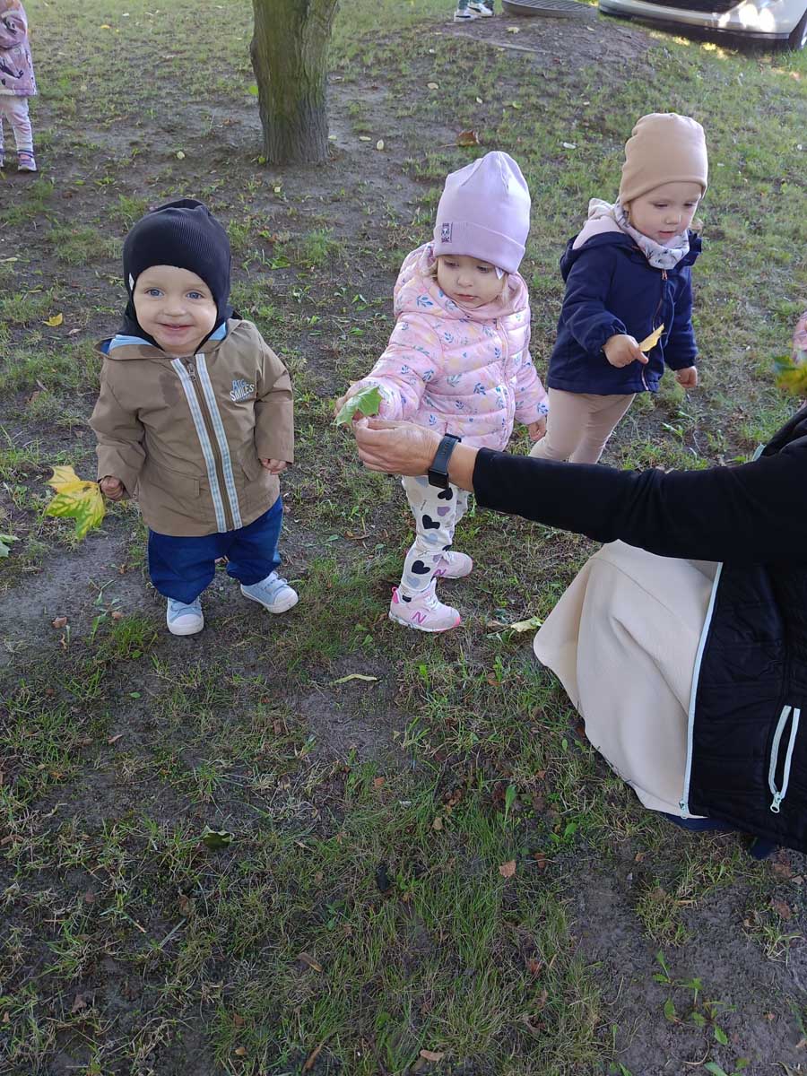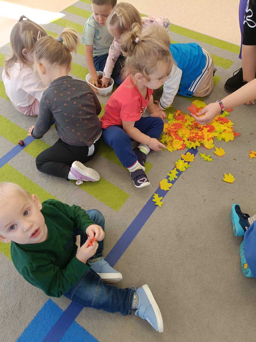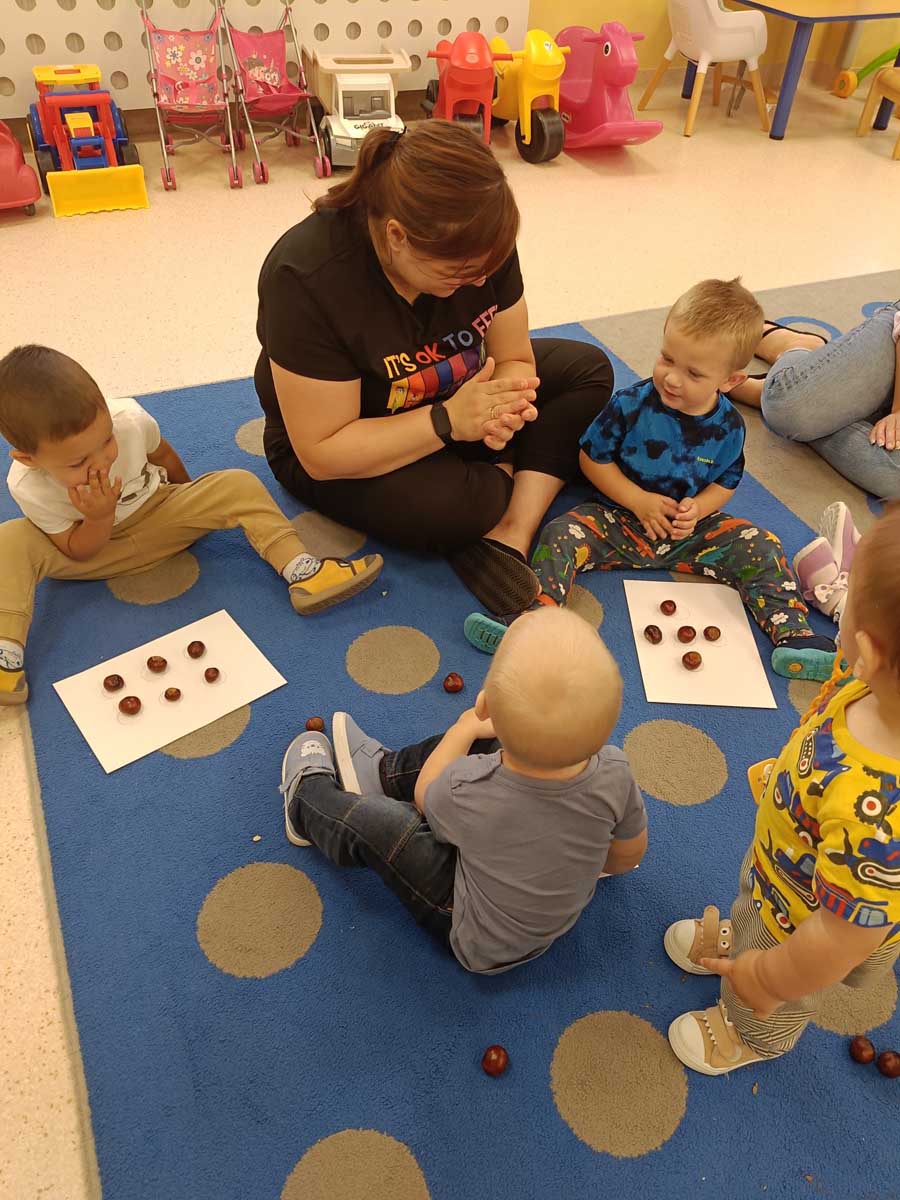 Dzieci uczestniczyły w zabawach integracyjnych z misiem Tedym i z piłką oraz przy muzyce umożliwiających poznanie imion koleżanek, kolegów oraz opiekunek. Zapoznały się z zasadami obowiązującymi w żłobku oraz na placu zabaw i podczas spacerów. Wykonywały ćwiczenia gimnastyczne, uczestniczyły w zabawach orientacyjno - porządkowych i muzyczno - ruchowych kształtujących ramiona i nogi oraz ogólną sprawność fizyczną. Rozwijały główne grupy mięśniowe, poczucie rytmu, umiejętność poruszania się po sali bez potrącania innych dzieci podczas zabaw rytmicznych na postawie publikacji „Tuptaj maluszku” autorstwa M. Konarskiego. Maluszki ćwiczyły też koordynację wzrokowo - ruchową bawiąc się pomponami, kropkami i kasztanami oraz usprawniały małą motorykę wykorzystując bibułę i podczas zabaw paluszkowych. Tworzyły prace plastyczne, plastyczno - sensoryczne oraz bawiły się sensorycznie wykorzystując ciastolinę, farby i makaron. Wspomagały aparat mowy wykonując ćwiczenia oddechowe i logopedyczne, jak również uczestniczyły w zabawach matematycznych kształtując umiejętności klasyfikowania według jednej cechy. Maluchy rozwijały także umiejętność manipulowania, zręczności i zachowania równowagi podczas zabaw konstrukcyjno - manipulacyjnych z wykorzystaniem różnego rodzaju klocków.