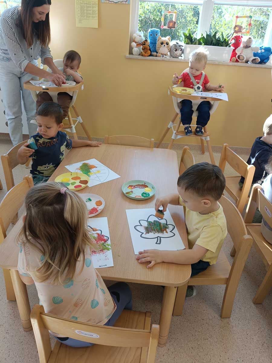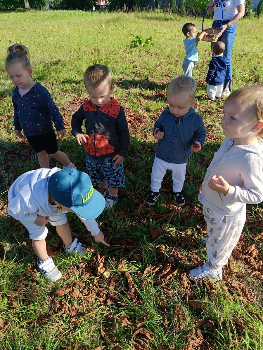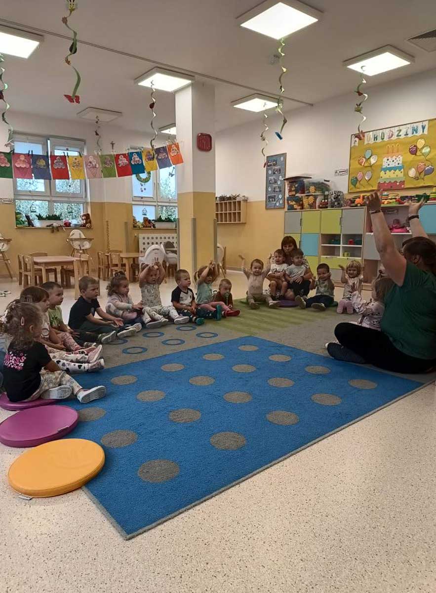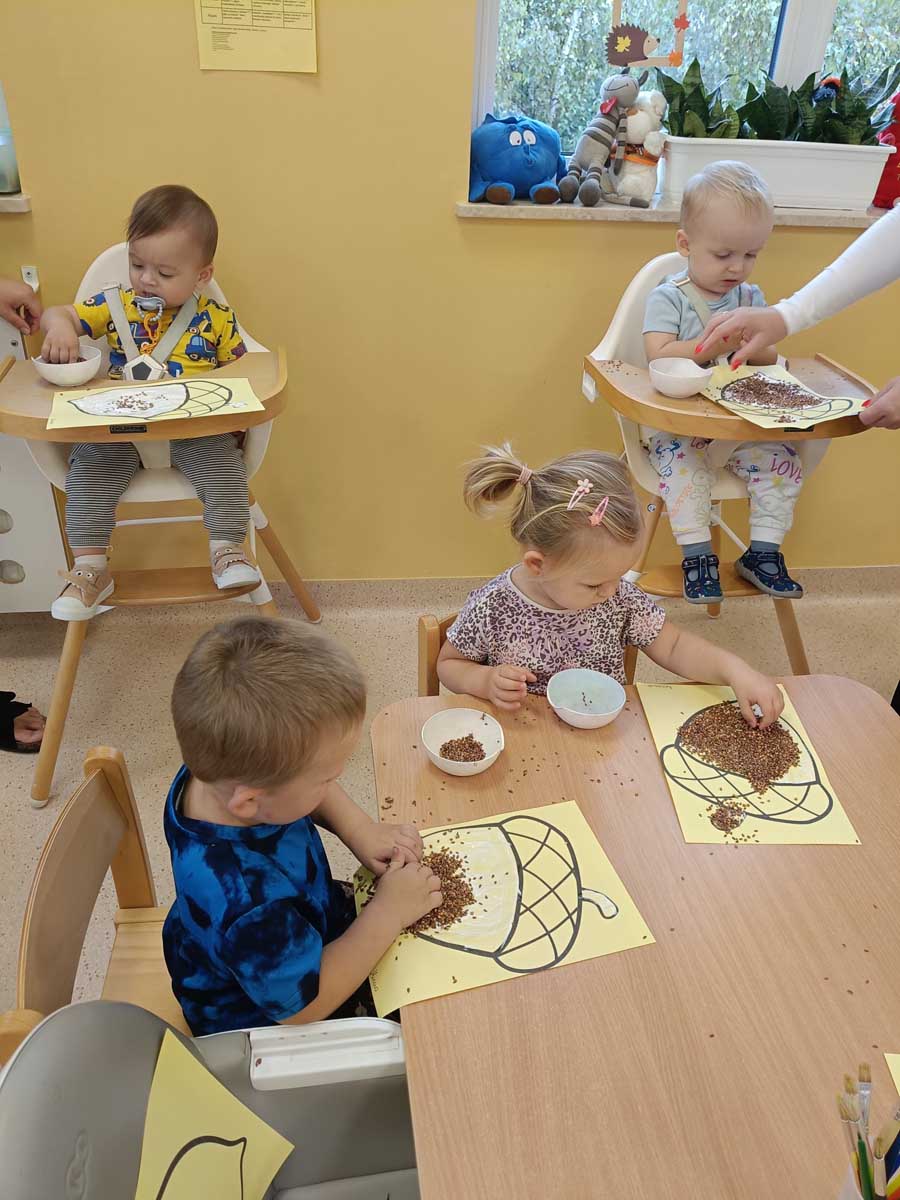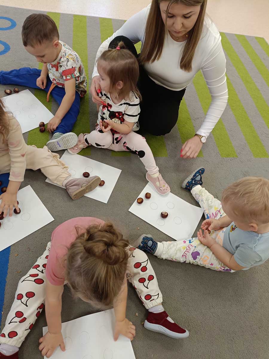 Dzieci uczestniczyły w zabawach integracyjnych z misiem Tedym i z piłką oraz przy muzyce umożliwiających poznanie imion koleżanek, kolegów oraz opiekunek. Zapoznały się z zasadami obowiązującymi w żłobku oraz na placu zabaw i podczas spacerów. Wykonywały ćwiczenia gimnastyczne, uczestniczyły w zabawach orientacyjno - porządkowych i muzyczno - ruchowych kształtujących ramiona i nogi oraz ogólną sprawność fizyczną. Rozwijały główne grupy mięśniowe, poczucie rytmu, umiejętność poruszania się po sali bez potrącania innych dzieci podczas zabaw rytmicznych na postawie publikacji „Tuptaj maluszku” autorstwa M. Konarskiego. Maluszki ćwiczyły też koordynację wzrokowo - ruchową bawiąc się pomponami, kropkami i kasztanami oraz usprawniały małą motorykę wykorzystując bibułę i podczas zabaw paluszkowych. Tworzyły prace plastyczne, plastyczno - sensoryczne oraz bawiły się sensorycznie wykorzystując ciastolinę, farby i makaron. Wspomagały aparat mowy wykonując ćwiczenia oddechowe i logopedyczne, jak również uczestniczyły w zabawach matematycznych kształtując umiejętności klasyfikowania według jednej cechy. Maluchy rozwijały także umiejętność manipulowania, zręczności i zachowania równowagi podczas zabaw konstrukcyjno - manipulacyjnych z wykorzystaniem różnego rodzaju klocków.