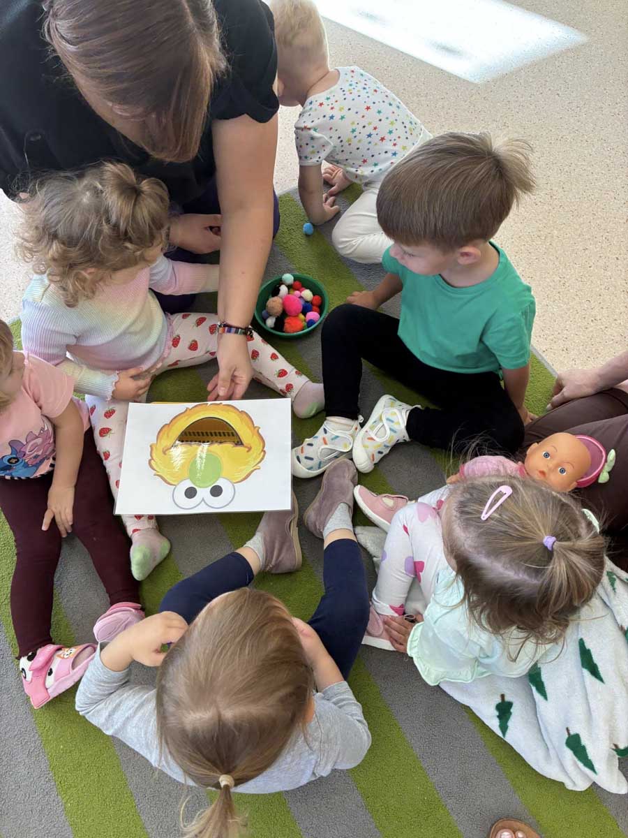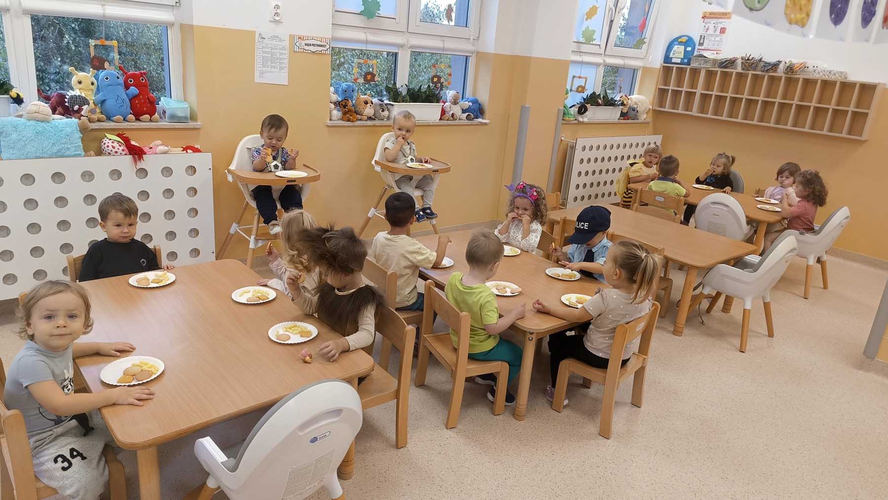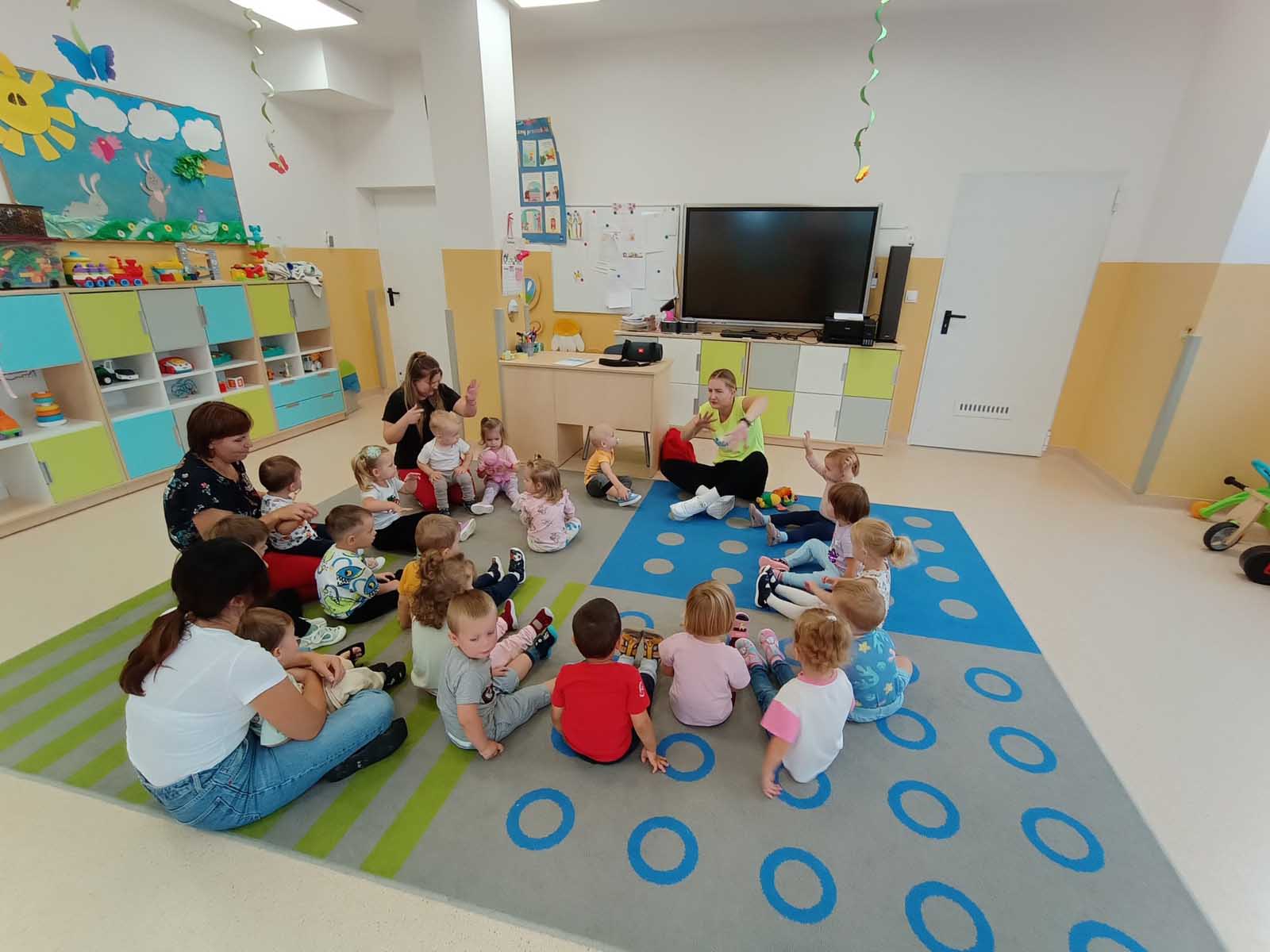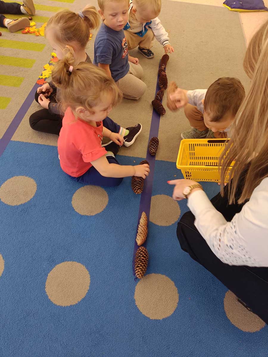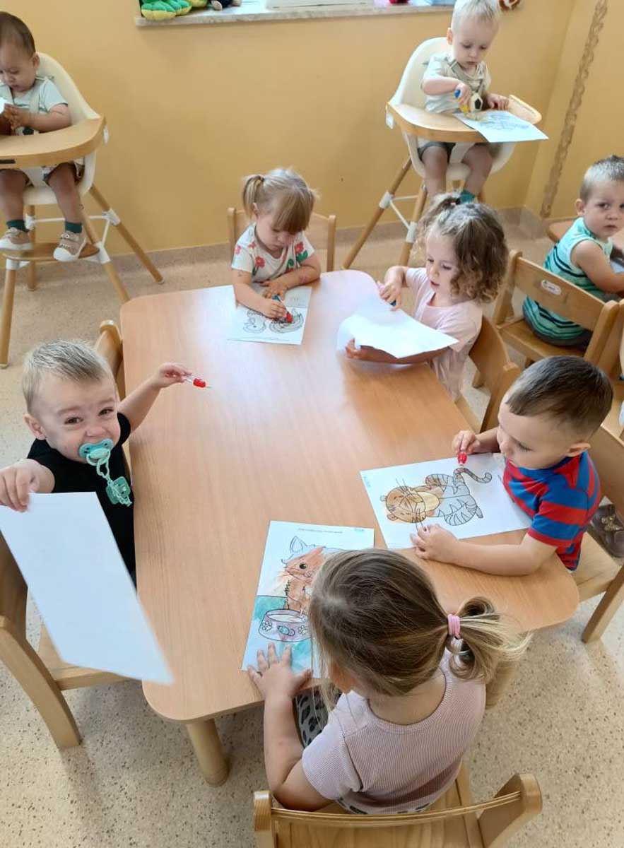 Dzieci uczestniczyły w zabawach integracyjnych z misiem Tedym i z piłką oraz przy muzyce umożliwiających poznanie imion koleżanek, kolegów oraz opiekunek. Zapoznały się z zasadami obowiązującymi w żłobku oraz na placu zabaw i podczas spacerów. Wykonywały ćwiczenia gimnastyczne, uczestniczyły w zabawach orientacyjno - porządkowych i muzyczno - ruchowych kształtujących ramiona i nogi oraz ogólną sprawność fizyczną. Rozwijały główne grupy mięśniowe, poczucie rytmu, umiejętność poruszania się po sali bez potrącania innych dzieci podczas zabaw rytmicznych na postawie publikacji „Tuptaj maluszku” autorstwa M. Konarskiego. Maluszki ćwiczyły też koordynację wzrokowo - ruchową bawiąc się pomponami, kropkami i kasztanami oraz usprawniały małą motorykę wykorzystując bibułę i podczas zabaw paluszkowych. Tworzyły prace plastyczne, plastyczno - sensoryczne oraz bawiły się sensorycznie wykorzystując ciastolinę, farby i makaron. Wspomagały aparat mowy wykonując ćwiczenia oddechowe i logopedyczne, jak również uczestniczyły w zabawach matematycznych kształtując umiejętności klasyfikowania według jednej cechy. Maluchy rozwijały także umiejętność manipulowania, zręczności i zachowania równowagi podczas zabaw konstrukcyjno - manipulacyjnych z wykorzystaniem różnego rodzaju klocków.