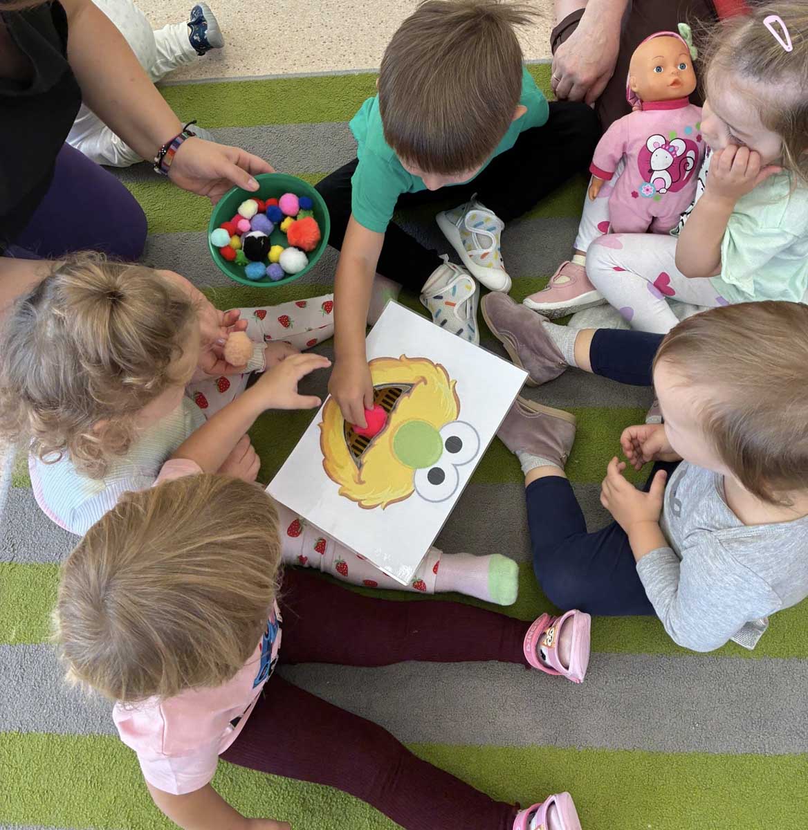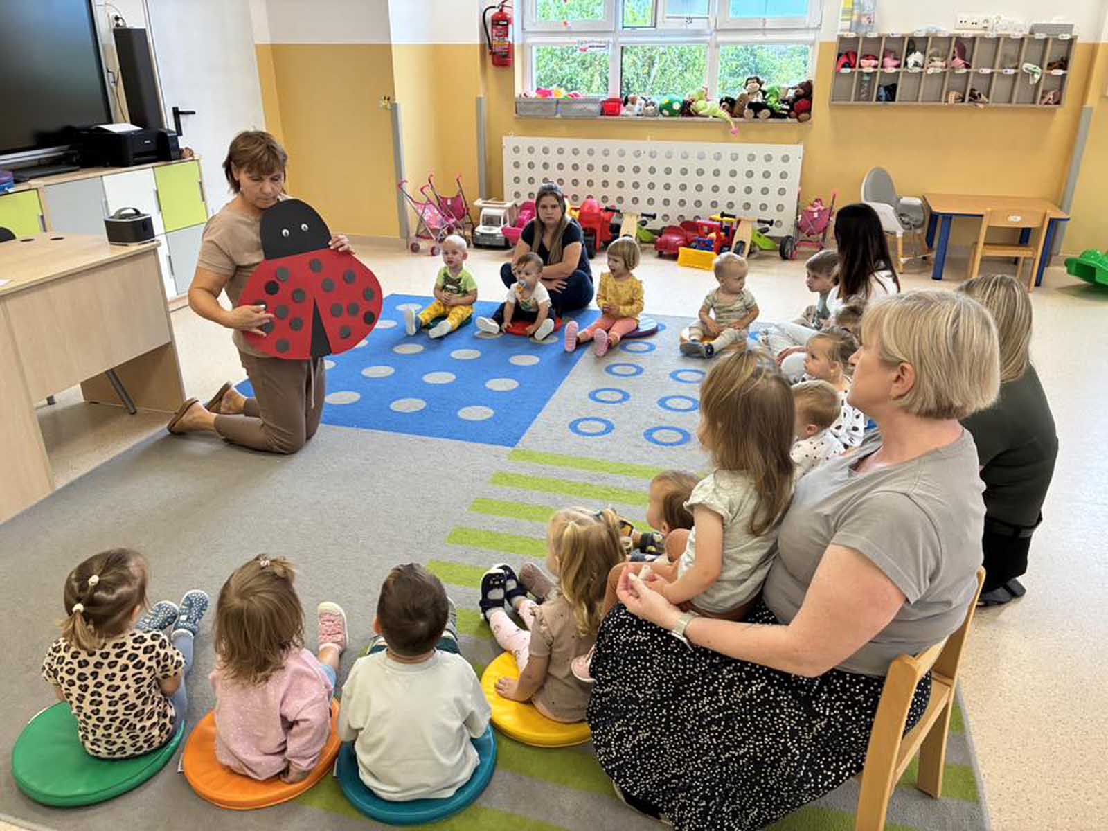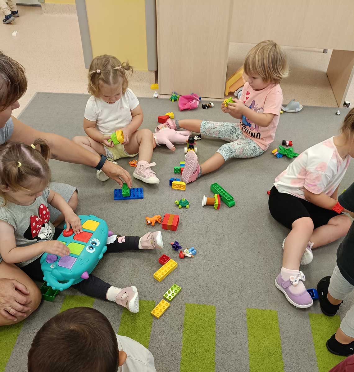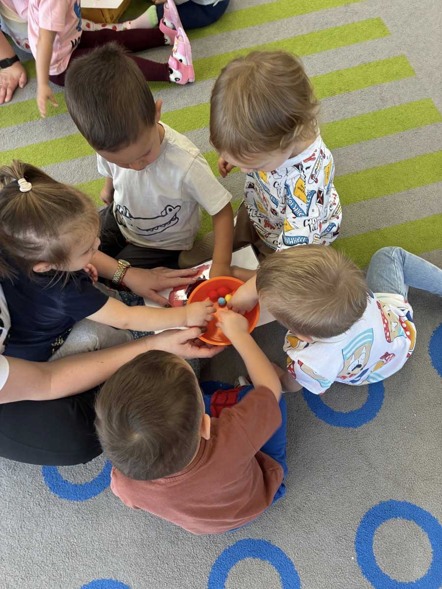 Dzieci uczestniczyły w zabawach integracyjnych z misiem Tedym i z piłką oraz przy muzyce umożliwiających poznanie imion koleżanek, kolegów oraz opiekunek. Zapoznały się z zasadami obowiązującymi w żłobku oraz na placu zabaw i podczas spacerów. Wykonywały ćwiczenia gimnastyczne, uczestniczyły w zabawach orientacyjno - porządkowych i muzyczno - ruchowych kształtujących ramiona i nogi oraz ogólną sprawność fizyczną. Rozwijały główne grupy mięśniowe, poczucie rytmu, umiejętność poruszania się po sali bez potrącania innych dzieci podczas zabaw rytmicznych na postawie publikacji „Tuptaj maluszku” autorstwa M. Konarskiego. Maluszki ćwiczyły też koordynację wzrokowo - ruchową bawiąc się pomponami, kropkami i kasztanami oraz usprawniały małą motorykę wykorzystując bibułę i podczas zabaw paluszkowych. Tworzyły prace plastyczne, plastyczno - sensoryczne oraz bawiły się sensorycznie wykorzystując ciastolinę, farby i makaron. Wspomagały aparat mowy wykonując ćwiczenia oddechowe i logopedyczne, jak również uczestniczyły w zabawach matematycznych kształtując umiejętności klasyfikowania według jednej cechy. Maluchy rozwijały także umiejętność manipulowania, zręczności i zachowania równowagi podczas zabaw konstrukcyjno - manipulacyjnych z wykorzystaniem różnego rodzaju klocków.