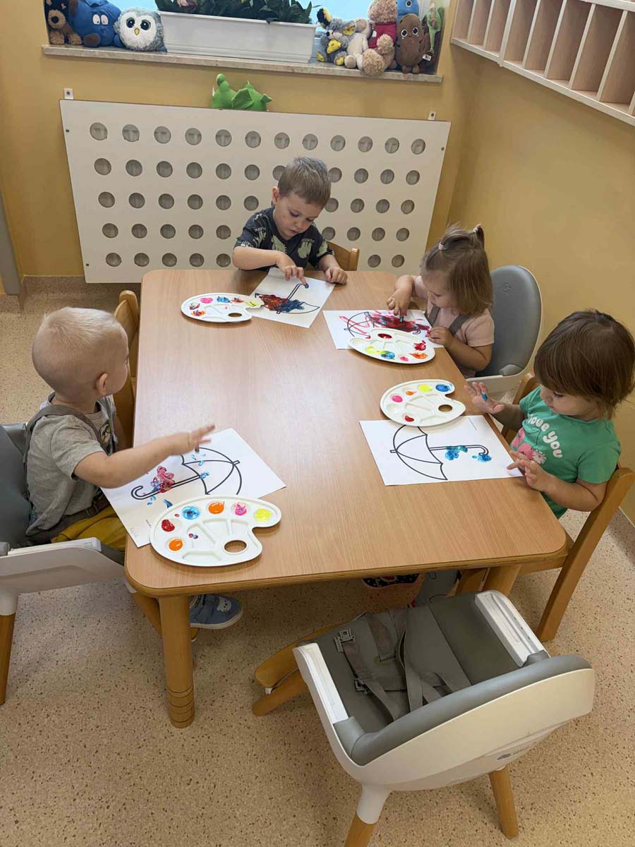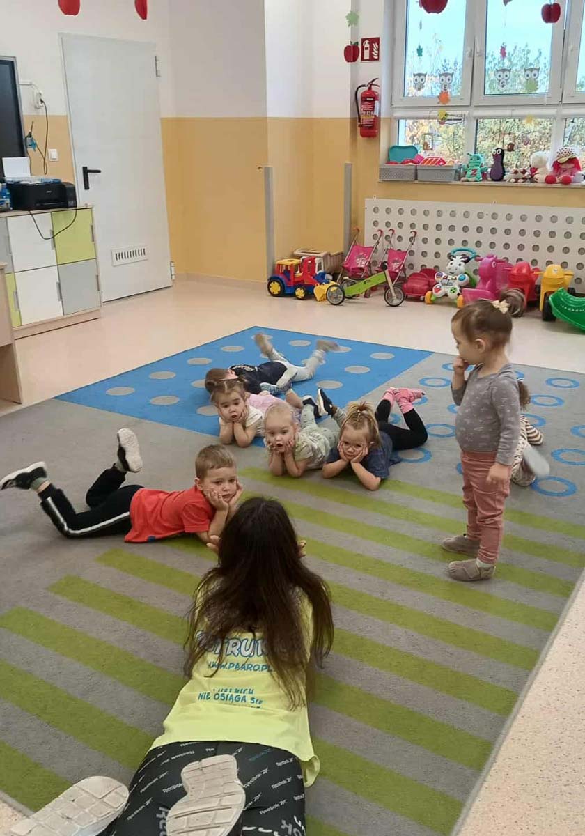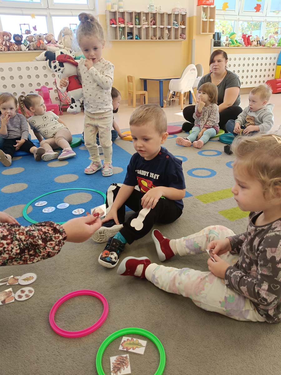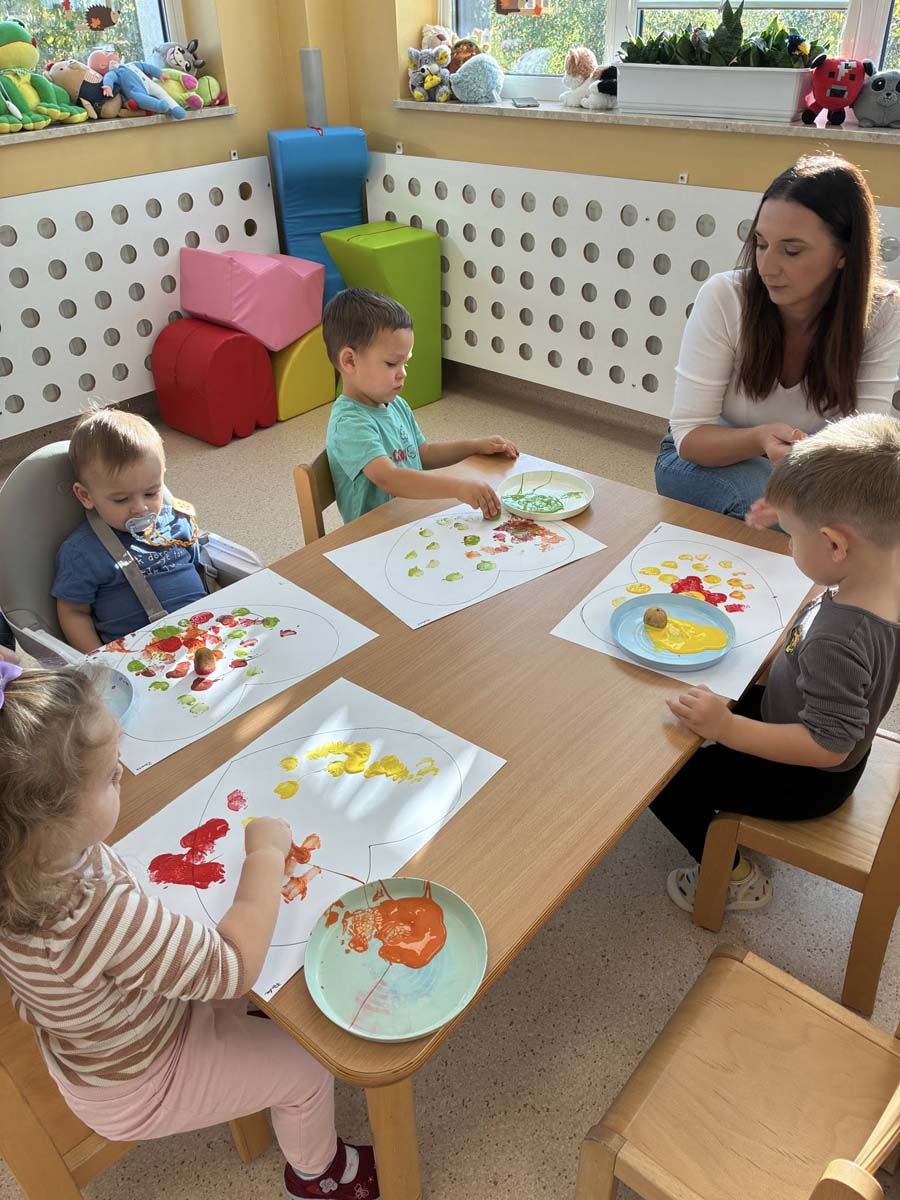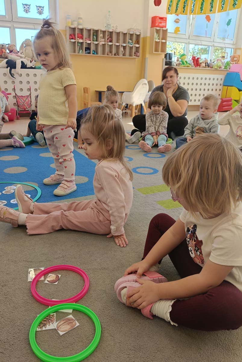 Maluszki rozwijały spostrzegawczość poprzez klasyfikowanie ilustracji według jednej cechy oraz kształtowały umiejętność stosowania pojęć orientacji przestrzennej: na, pod, obok. Zachęcone podczas pogadanek dydaktycznych podejmowały próby wypowiadania się w oparciu o historyjki obrazkowe bądź ilustracje. Dzieci usprawniały też narządy mowy podczas zabaw logopedycznych oraz oddechowych. Rozwijały zmysł słuchu poprzez zaznajomienie z instrumentem - ukulele oraz gry na instrumentach perkusyjnych. Podczas zabaw manualnych ćwiczyły precyzję ruchów dłoni, motorykę małą i koordynację wzrokowo - ruchową. Doskonaliły ogólną sprawność ruchową podczas zabaw muzyczno - ruchowych, orientacyjno - porządkowych, rytmicznych oraz z wykorzystaniem kart ruchowych. Maluszki uczestniczyły w zabawach paluszkowych, relaksacyjnych oraz ćwiczących równowagę i stabilność zwiększając koncentrację, a także precyzję ruchów. Ilustrowały słowa rymowanek i wierszy, jak również dzieliły słowa na sylaby poprzez wyklaskiwanie. Pobudzając wyobraźnię, rozwijając spostrzegawczość i sprawność manualną tworzyły także prace plastyczne i plastyczno - sensoryczne.