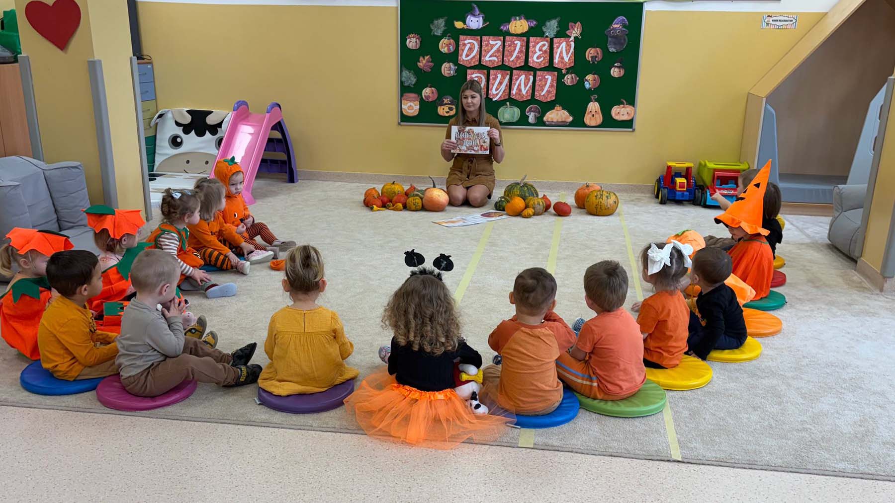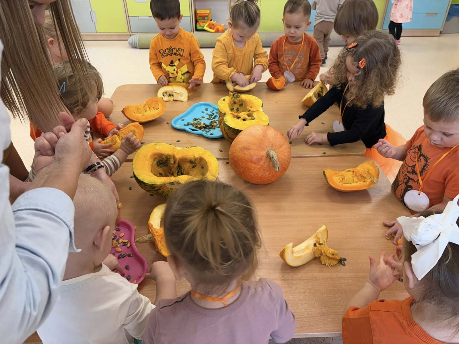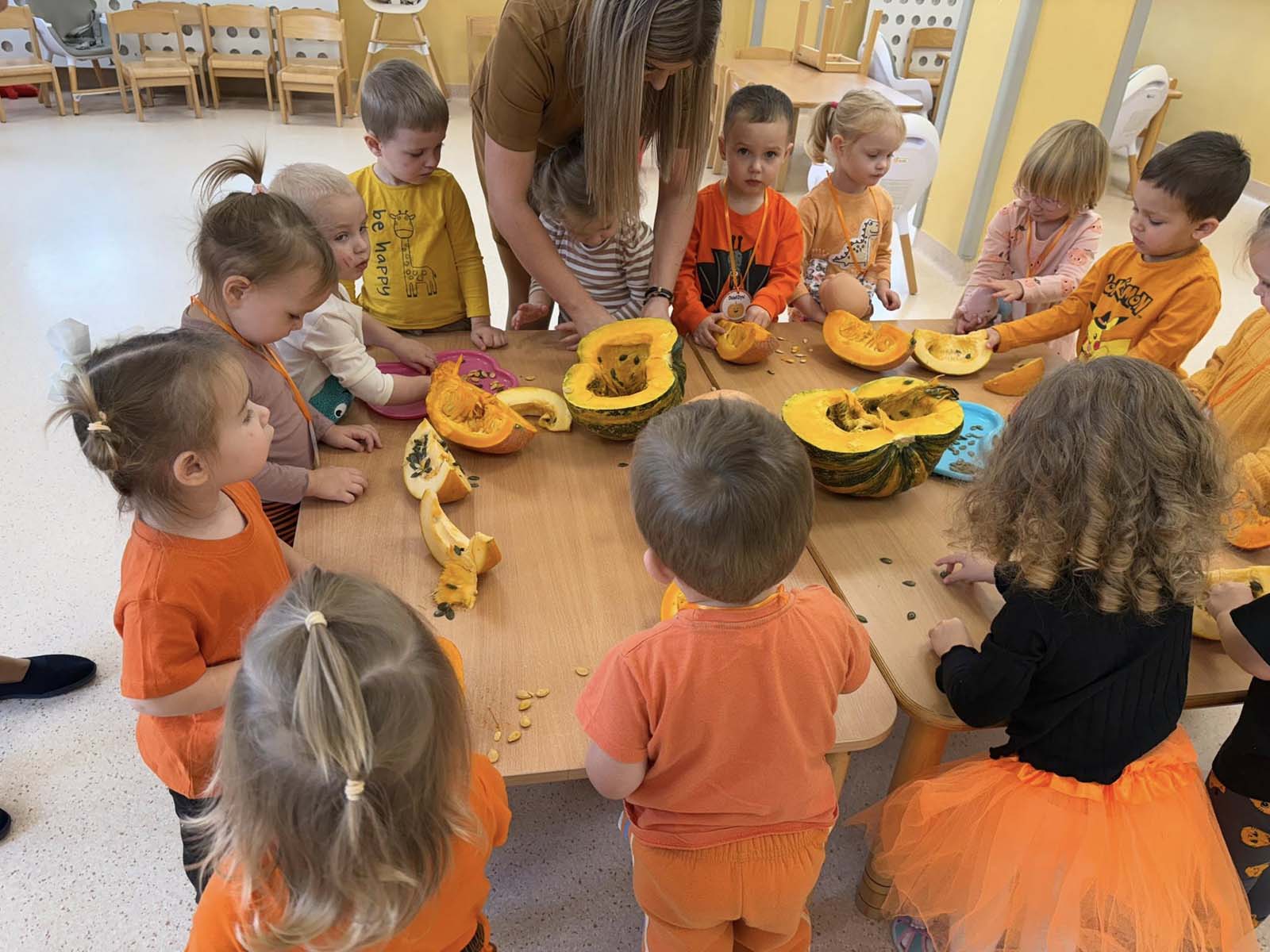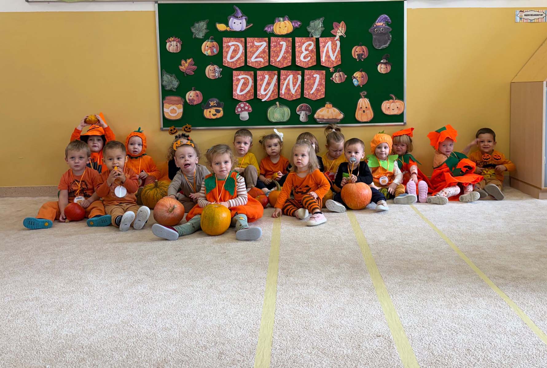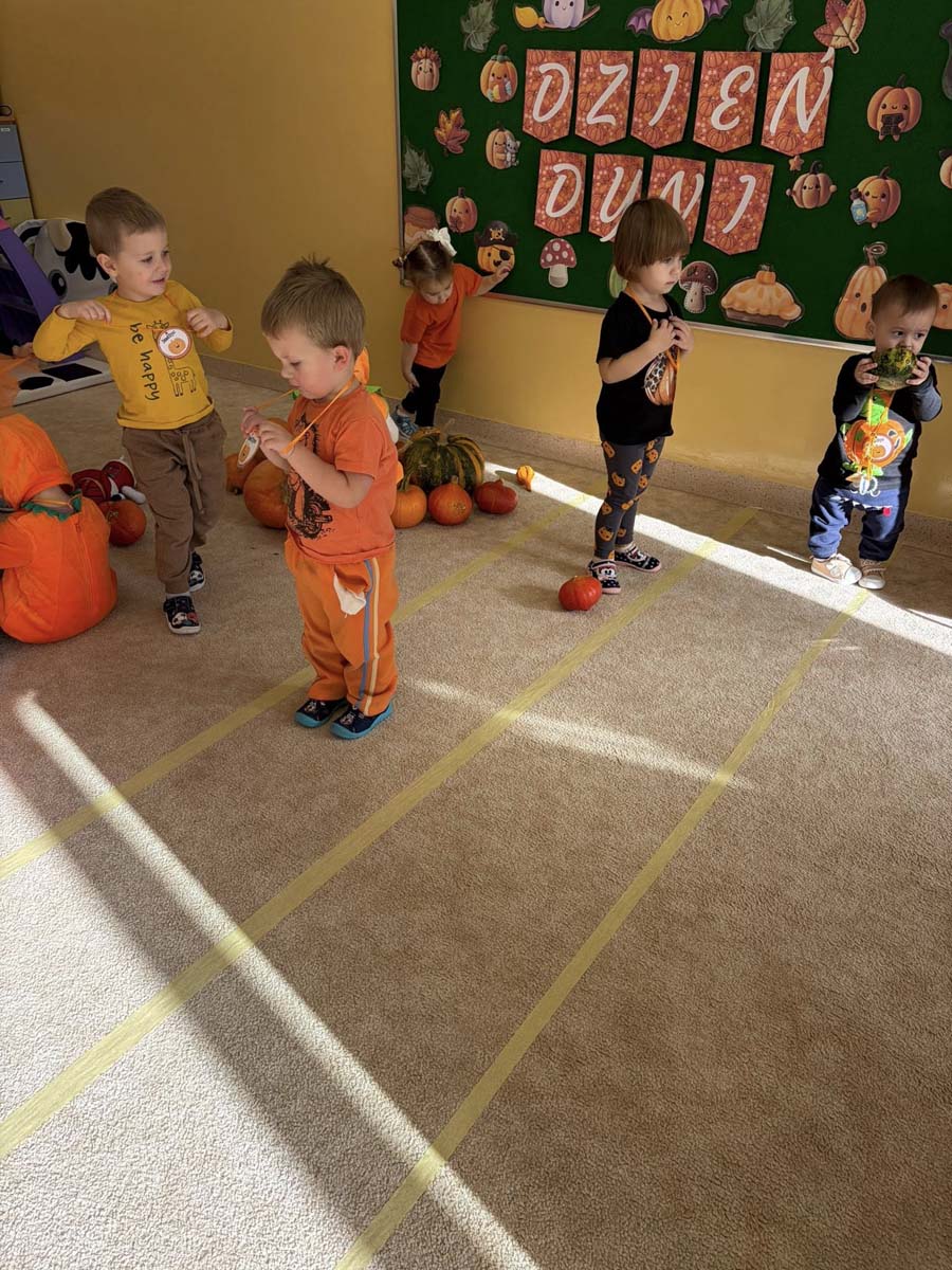 Z okazji „Dnia Dyni” dzieci poznawały różne rodzaje dyń – oglądały je, dotykały i porównywały ich kolory oraz kształty. Z ogromnym zainteresowaniem zaglądały też do środka dyni, wspólnie wydrążając ją i wyciągając ziarenka. Nie zabrakło ruchu i świetnej zabawy! Maluchy wzięły udział w dyniowej gimnastyce z kartami ruchowymi, która dostarczyła im mnóstwo śmiechu i energii. Dzieci wesoło tańczyły do piosenki „Dynia Dana”, a także brały udział w mini zawodach w toczeniu dyni. Za swoje zaangażowanie i uśmiechy każdy mały uczestnik otrzymał pamiątkowy medal. Na zakończenie tego pełnego atrakcji dnia dzieci skosztowały pysznej pieczonej dyni, a następnie ulepiły z masy solnej własne mini dynie, które będą piękną pamiątką naszego święta. To był wspaniały, pomarańczowy dzień pełen radości, ruchu i zabawy.
