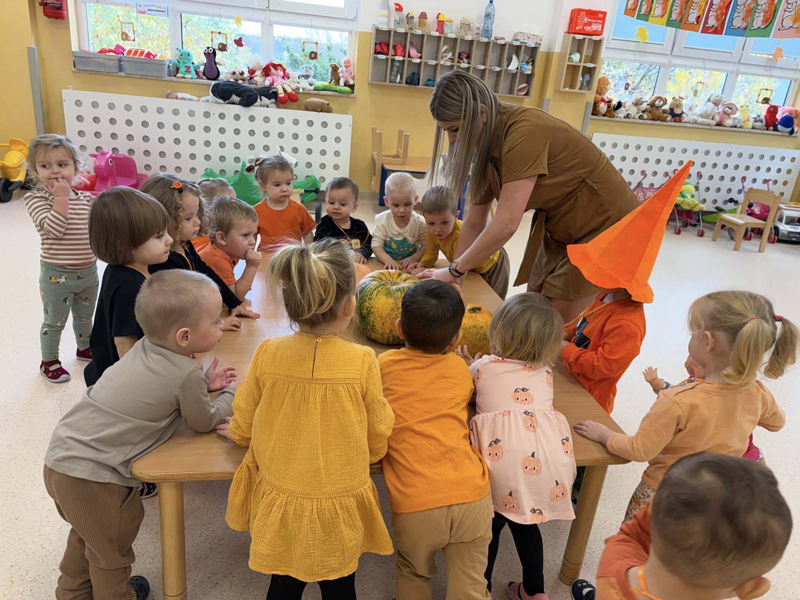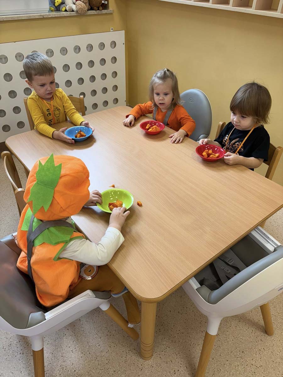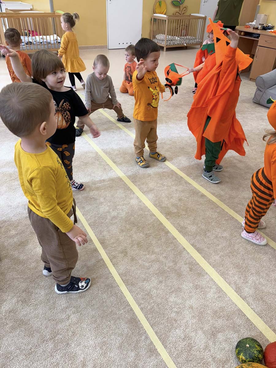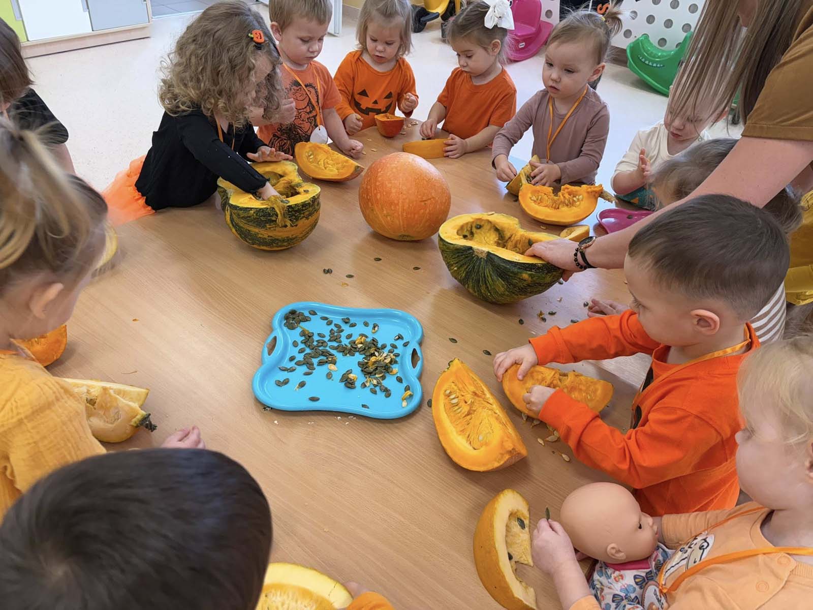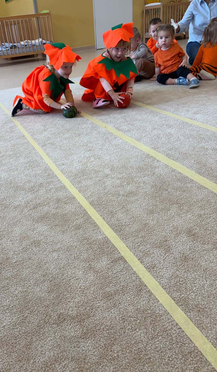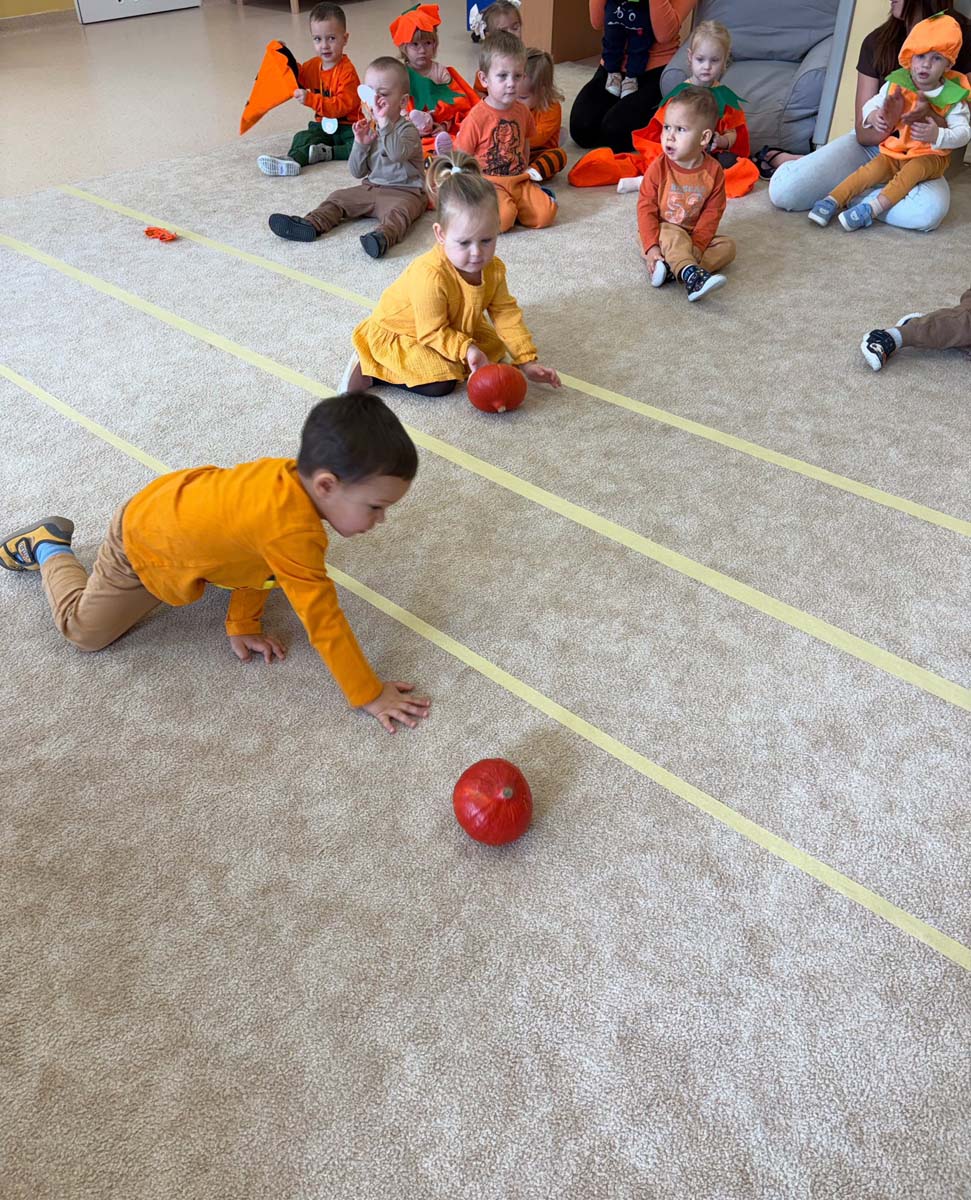 Z okazji „Dnia Dyni” dzieci poznawały różne rodzaje dyń – oglądały je, dotykały i porównywały ich kolory oraz kształty. Z ogromnym zainteresowaniem zaglądały też do środka dyni, wspólnie wydrążając ją i wyciągając ziarenka. Nie zabrakło ruchu i świetnej zabawy! Maluchy wzięły udział w dyniowej gimnastyce z kartami ruchowymi, która dostarczyła im mnóstwo śmiechu i energii. Dzieci wesoło tańczyły do piosenki „Dynia Dana”, a także brały udział w mini zawodach w toczeniu dyni. Za swoje zaangażowanie i uśmiechy każdy mały uczestnik otrzymał pamiątkowy medal. Na zakończenie tego pełnego atrakcji dnia dzieci skosztowały pysznej pieczonej dyni, a następnie ulepiły z masy solnej własne mini dynie, które będą piękną pamiątką naszego święta. To był wspaniały, pomarańczowy dzień pełen radości, ruchu i zabawy.