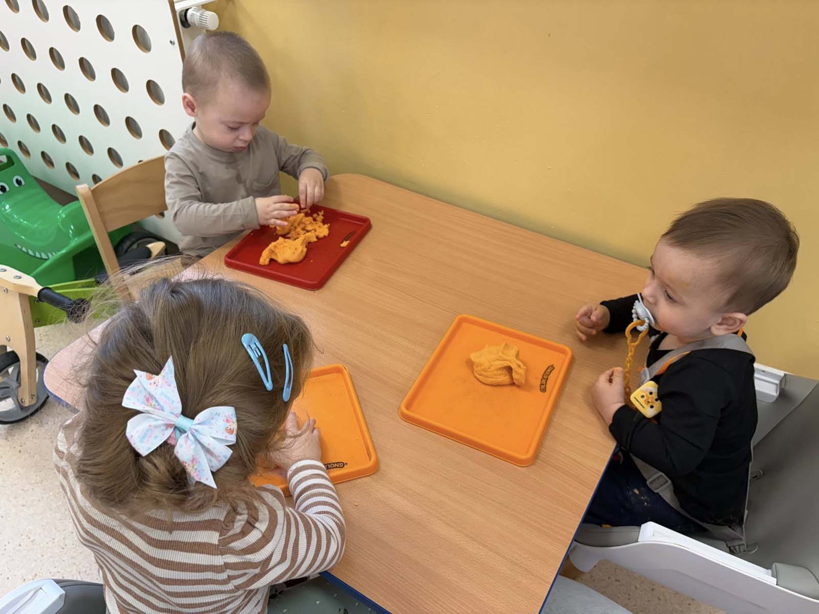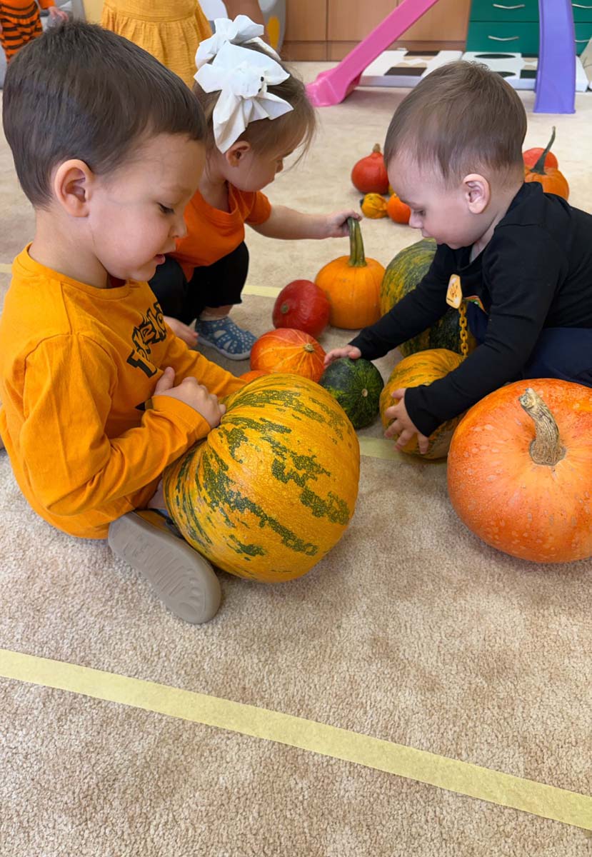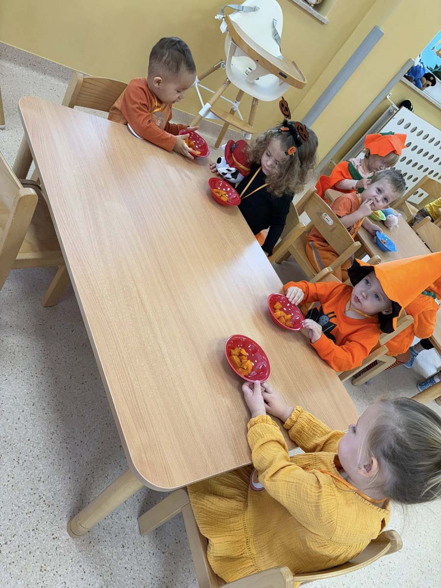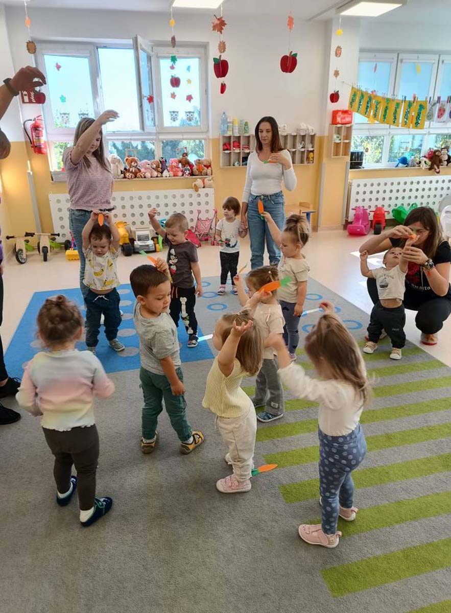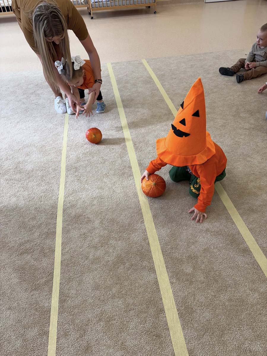 Z okazji „Dnia Dyni” dzieci poznawały różne rodzaje dyń – oglądały je, dotykały i porównywały ich kolory oraz kształty. Z ogromnym zainteresowaniem zaglądały też do środka dyni, wspólnie wydrążając ją i wyciągając ziarenka. Nie zabrakło ruchu i świetnej zabawy! Maluchy wzięły udział w dyniowej gimnastyce z kartami ruchowymi, która dostarczyła im mnóstwo śmiechu i energii. Dzieci wesoło tańczyły do piosenki „Dynia Dana”, a także brały udział w mini zawodach w toczeniu dyni. Za swoje zaangażowanie i uśmiechy każdy mały uczestnik otrzymał pamiątkowy medal. Na zakończenie tego pełnego atrakcji dnia dzieci skosztowały pysznej pieczonej dyni, a następnie ulepiły z masy solnej własne mini dynie, które będą piękną pamiątką naszego święta. To był wspaniały, pomarańczowy dzień pełen radości, ruchu i zabawy.