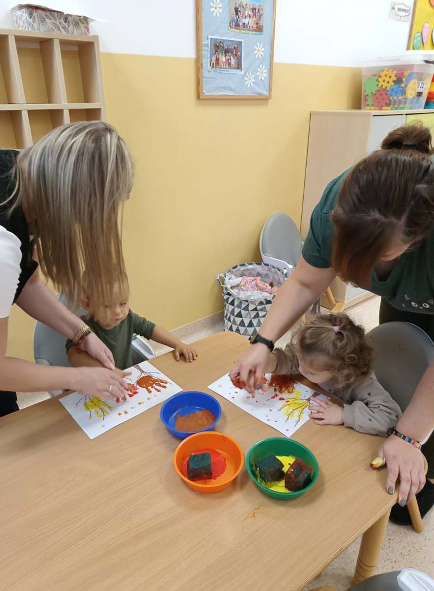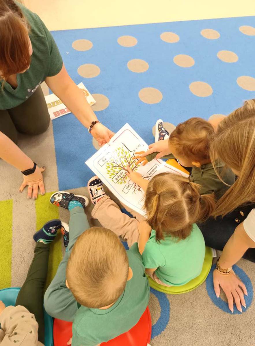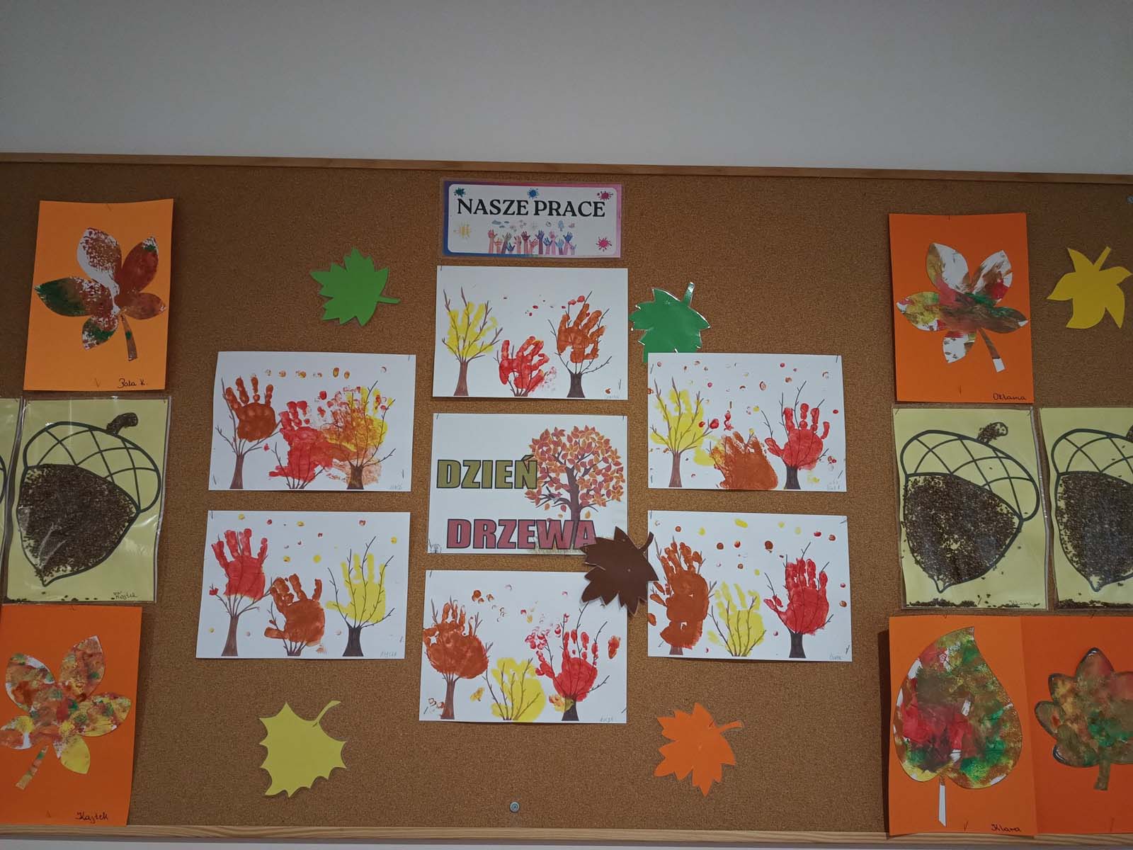 „Słoneczka” uczciły „Dzień drzewa” poprzez zabawy rozwijające spostrzegawczość wzrokową, koncentrację uwagi oraz umiejętności manualne. Poznały budowę drzewa opisując ilustrację, a także ilustrując słowa wiersza za D. Górą: „Vademecum zabaw: Jesień” pt. „Drzewo”. Układały puzzle przedstawiające różne rodzaje drzew m.in.: brzozę, dąb, czy lipę. „Słoneczka” bawiły się sensorycznie podczas „łowienia”- wyciągania liści z wody za pomocą pęsety, a także tańczyły do poznanej wcześniej melodii piosenki pt. „Wieje, wieje wiatr”. Zwieńczeniem wspólnych zabaw była praca plastyczno - sensoryczna pt. „Jesienne drzewa”, którą wykonały stemplując farbą za pomocą dłoni. Był to pełen atrakcji, radosny, jesienny czas.