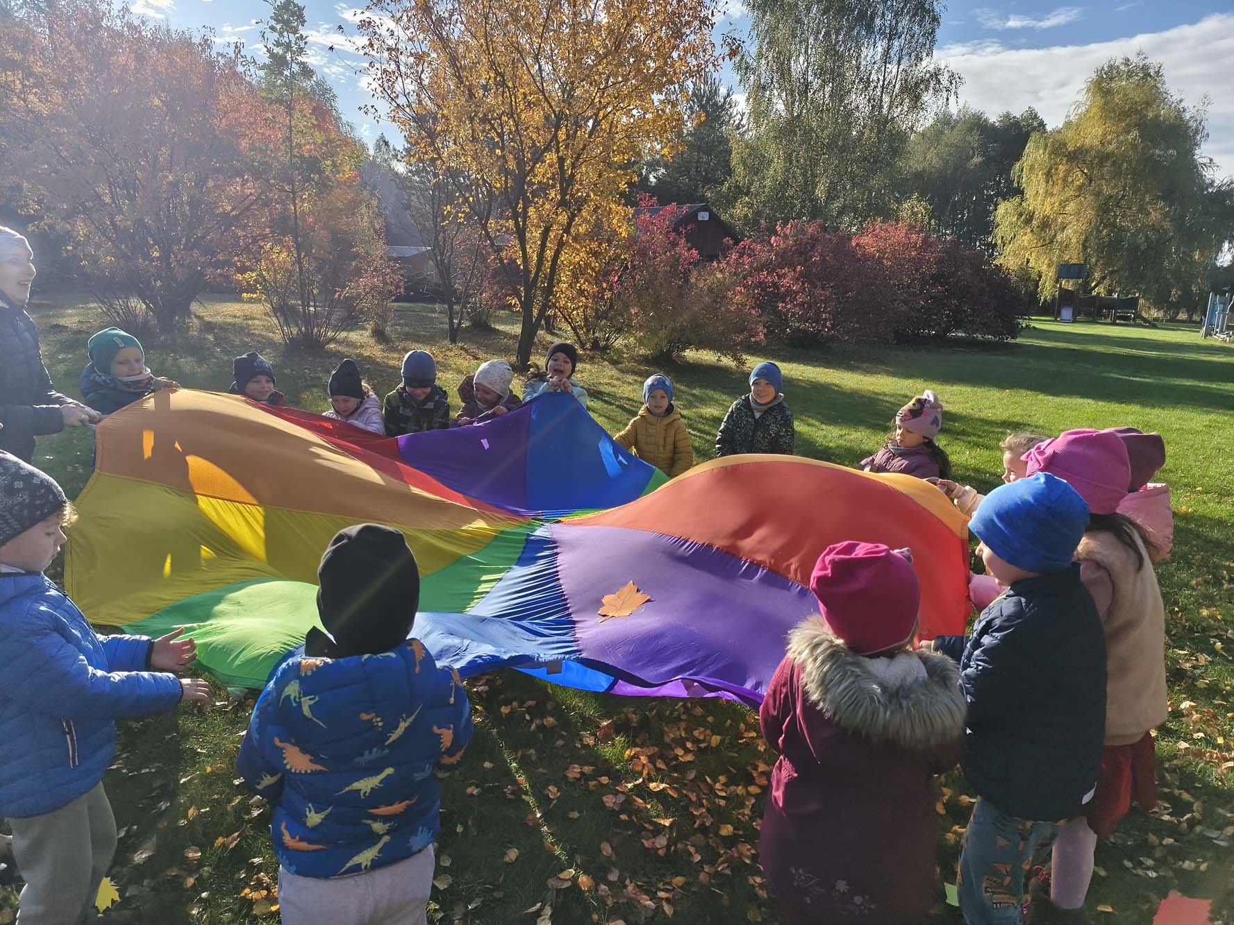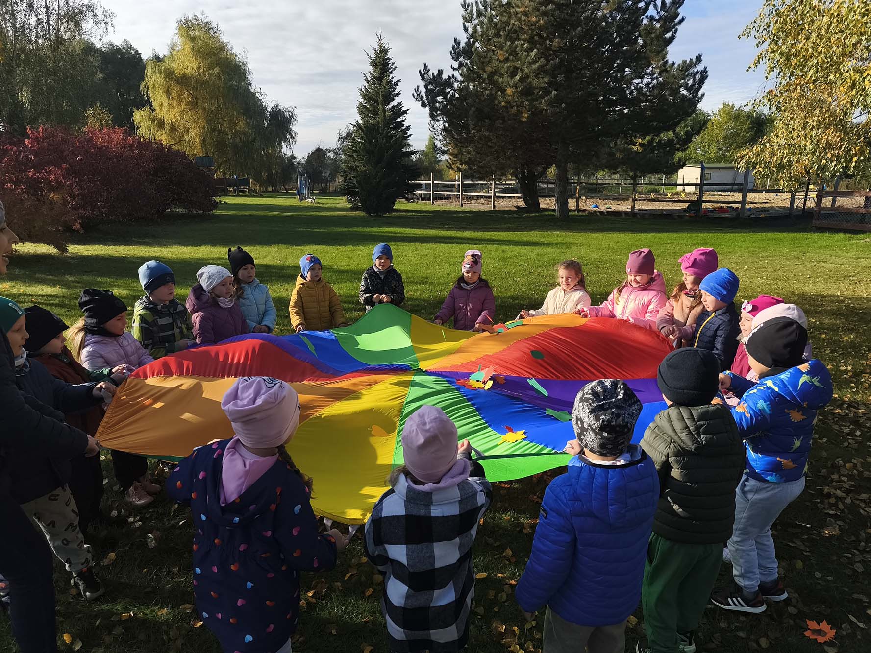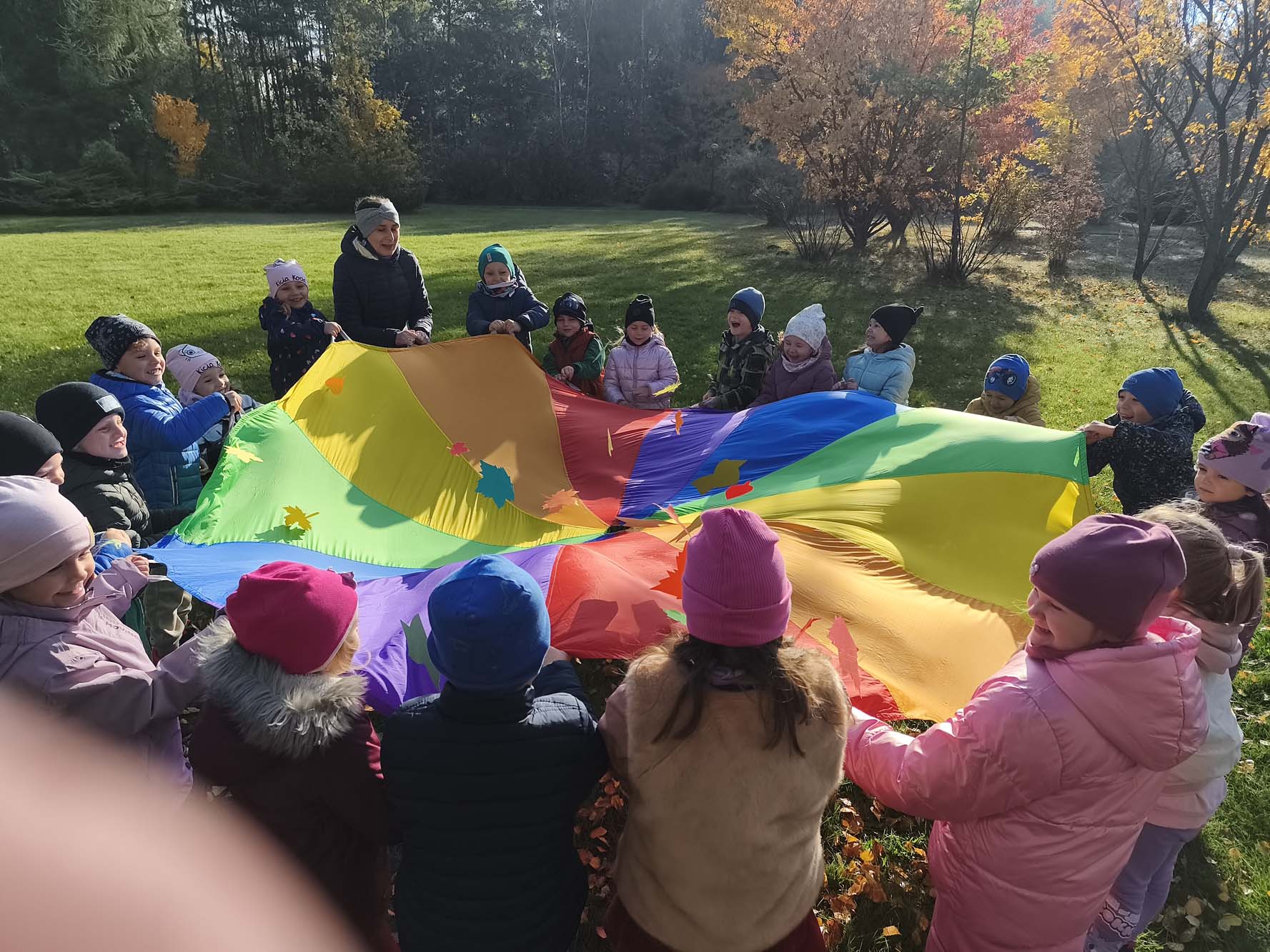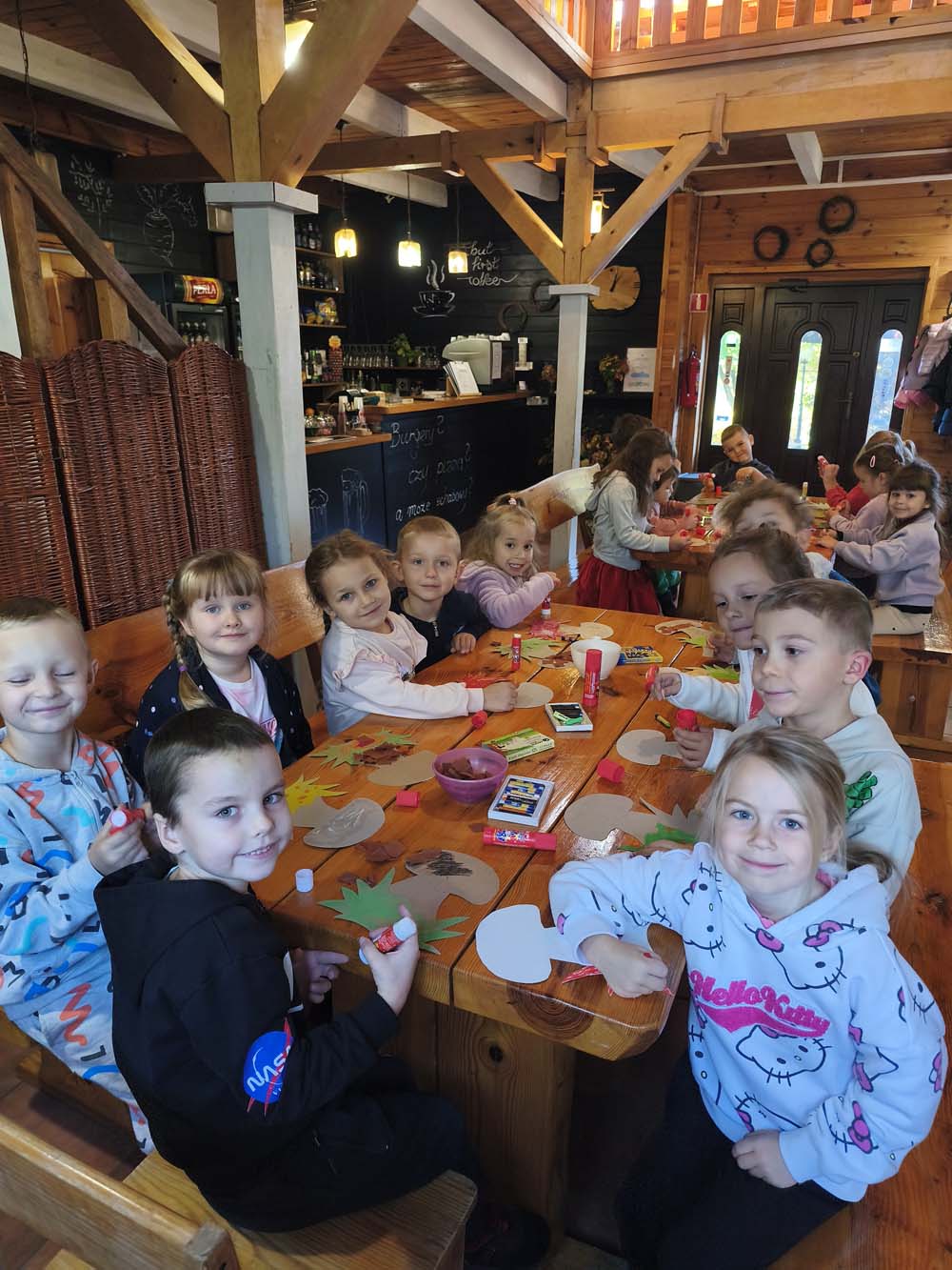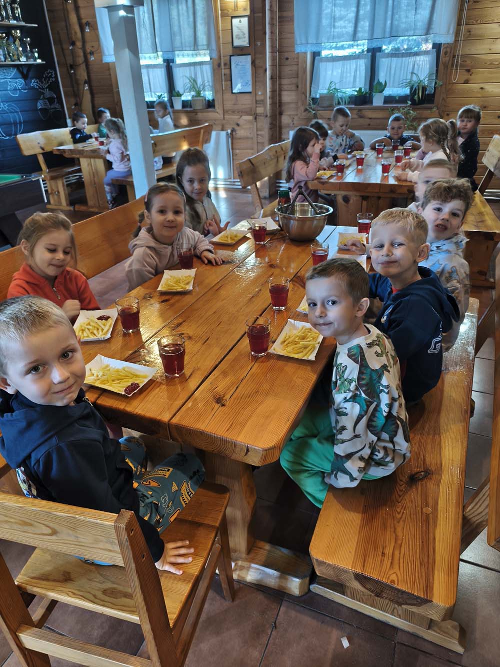 Dzieci zmierzyły się z jesiennymi konkurencjami: przeliczały kolorowe liście, dopasowywały warzywa do ich konturów, uczestniczyły w zabawach z chustą animacyjną, a także wyklejały jesienne grzyby bibułą. Wyprawa przedszkolaków zakończyła się wspólnym poczęstunkiem w lokalnej restauracji. Ruch i zabawy na świeżym powietrzu zaostrzyły nasz apetyt na pyszne frytki.