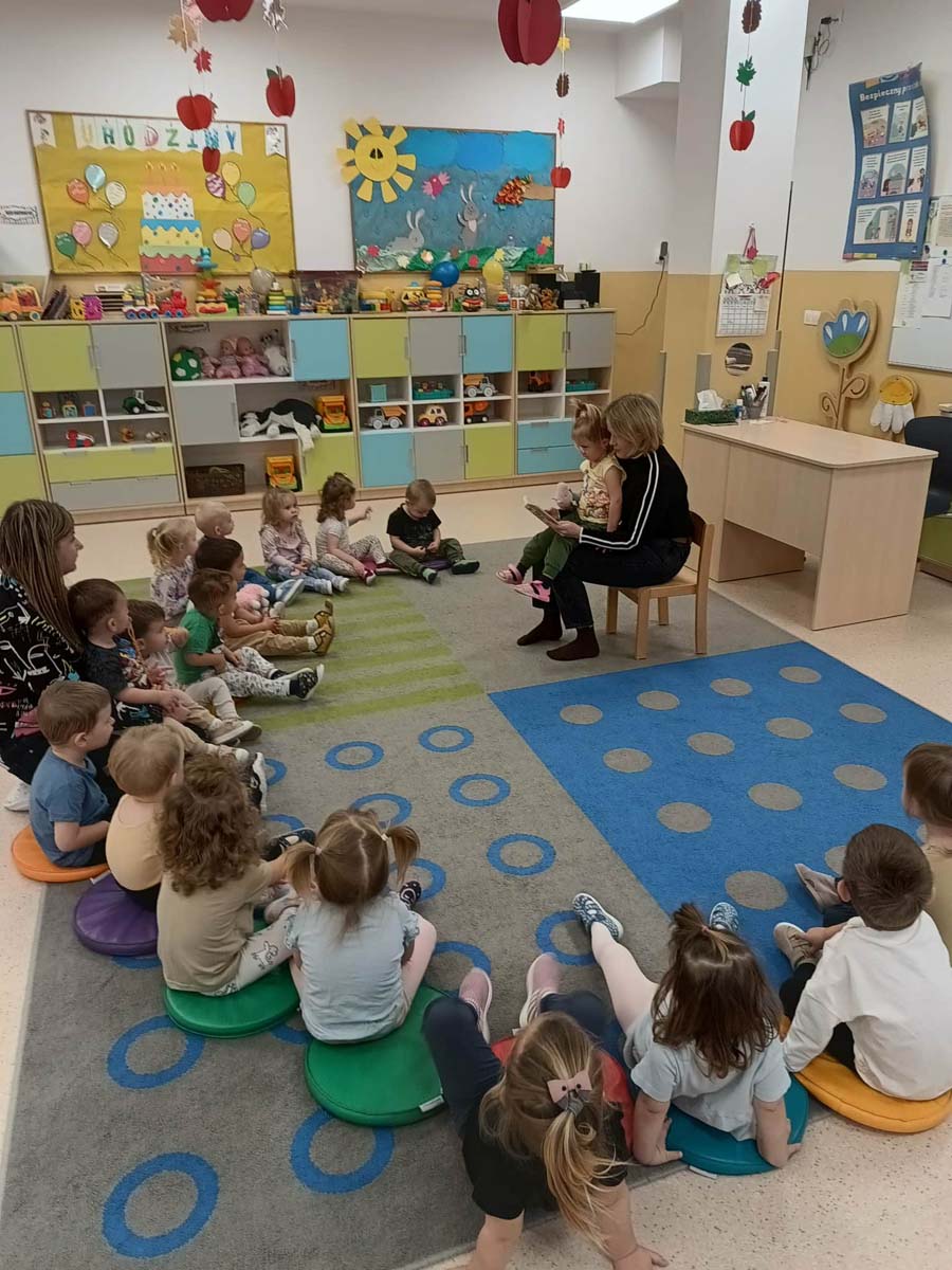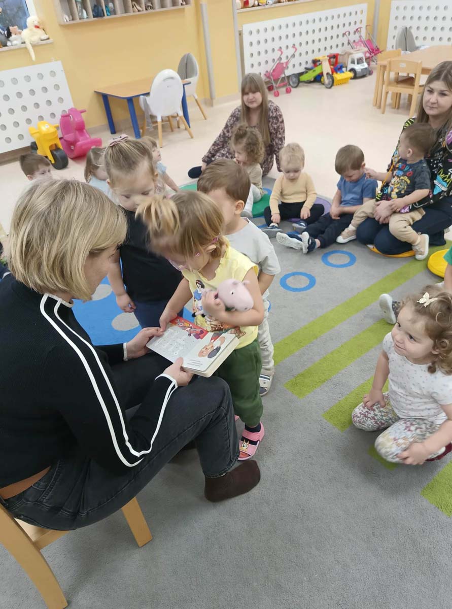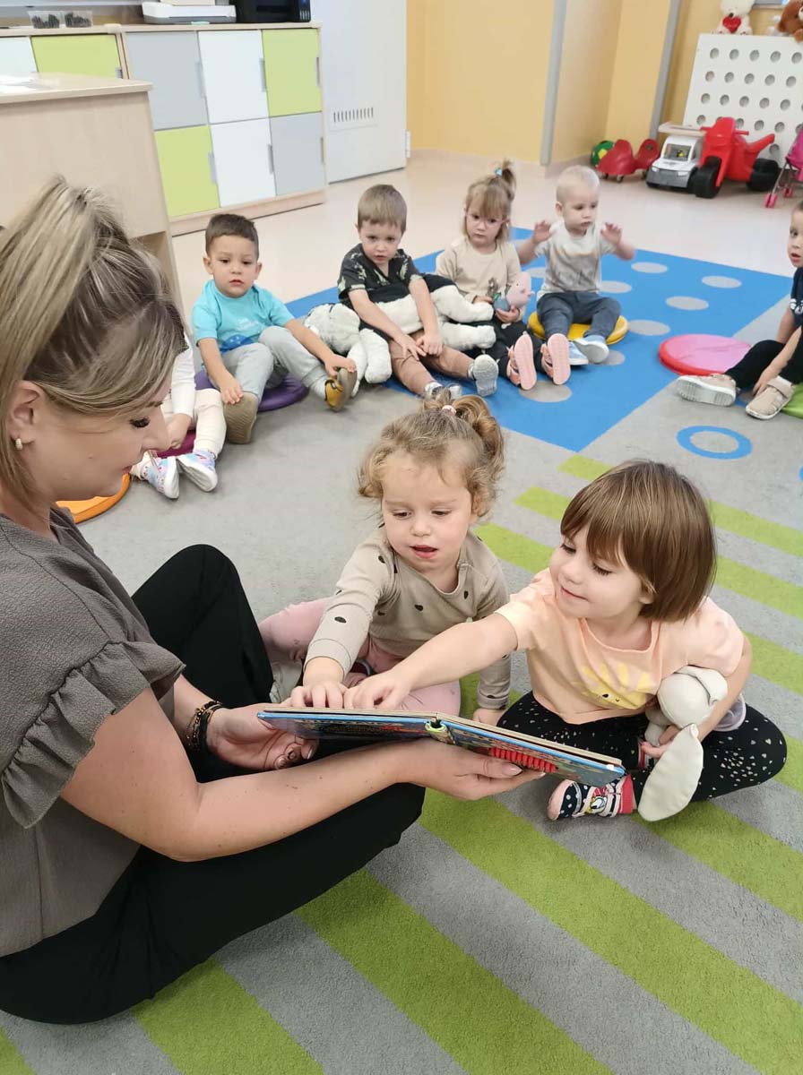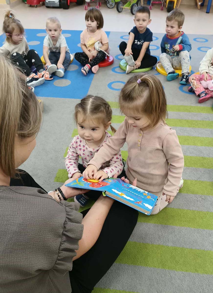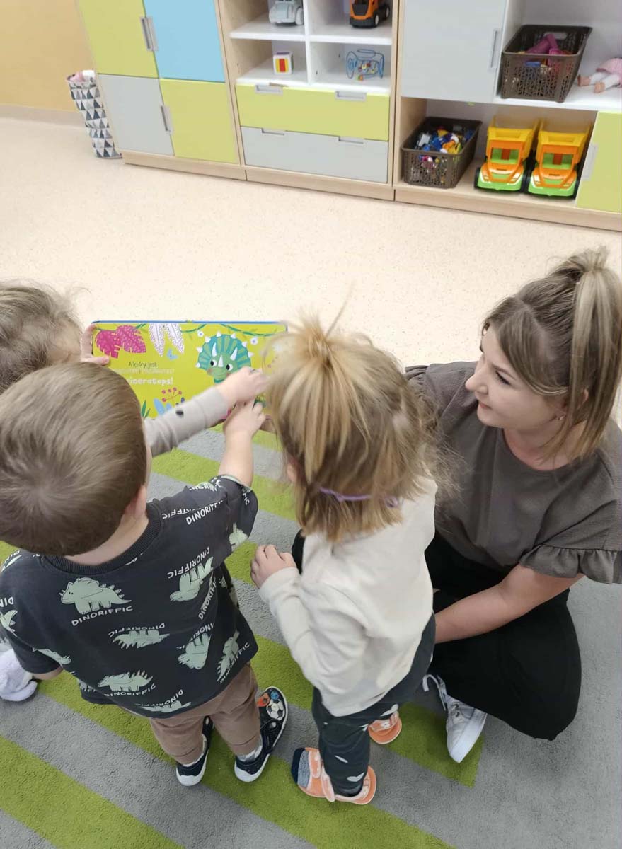 Maluchy naśladowały czynności przedstawione w książkach, powtarzały słowa, zwroty oraz wyrazy dźwiękonaśladowcze, a także dotykały różnych faktur. Dowiedziały się jak ważne jest zachowanie porządku wokół siebie oraz dbanie o czystość i dobre samopoczucie. Poznały też nazwy dinozaurów, ich zwyczaje i wygląd. Wspólne czytanie było okazją do ciekawie spędzonego czasu oraz integracji.