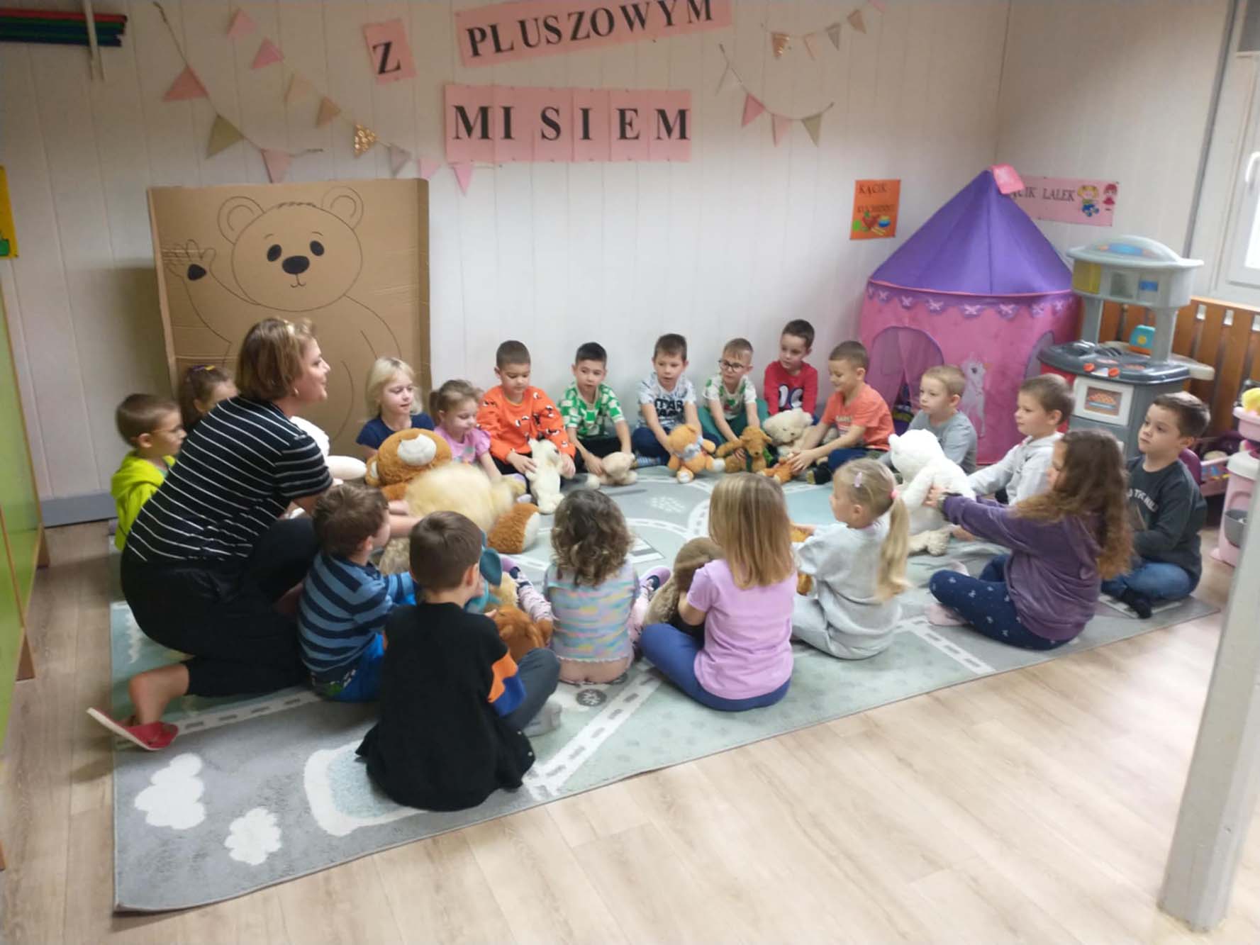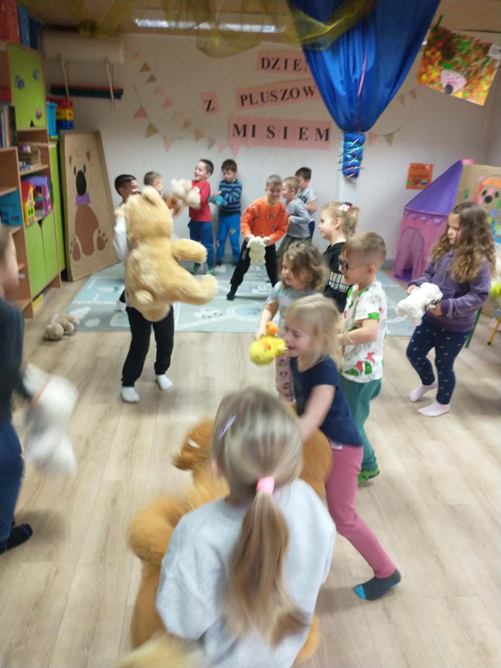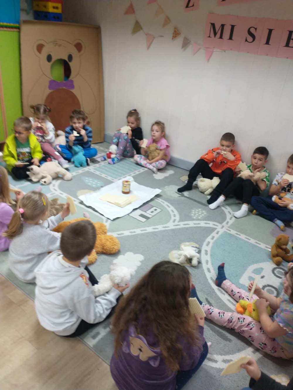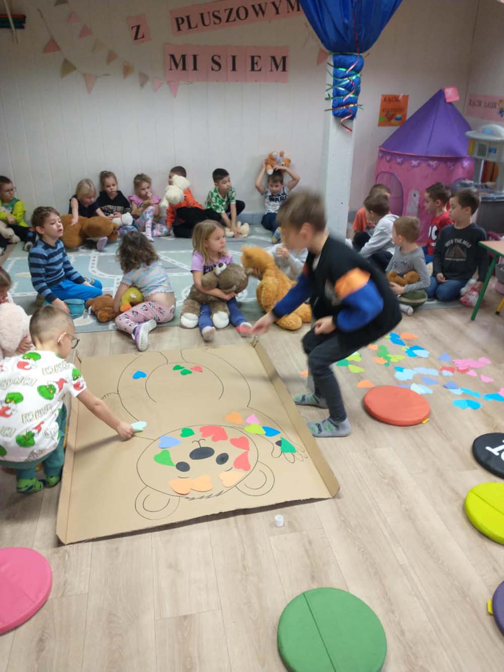 Każde dziecko miało swojego milutkiego przyjacielem, by wspólnie z innymi celebrować te pełne radości chwile. Na dzieci i ich misie czekało wiele atrakcji. Poznały historię święta, bawiły się przy misiowych piosenkach, uczestniczyły w zabawach ruchowych i zręcznościowych. Nie zabrakło konkursów, quizów i zgadywanek o słynnych misiach występujących w znanych bajkach. Przedszkolaki również wykonały przepiękne prace plastyczne z misiem w roli głównej. Chętne dzieci mogły także skosztować pysznego przysmaku wszystkich misiów - słodkiego miodku.