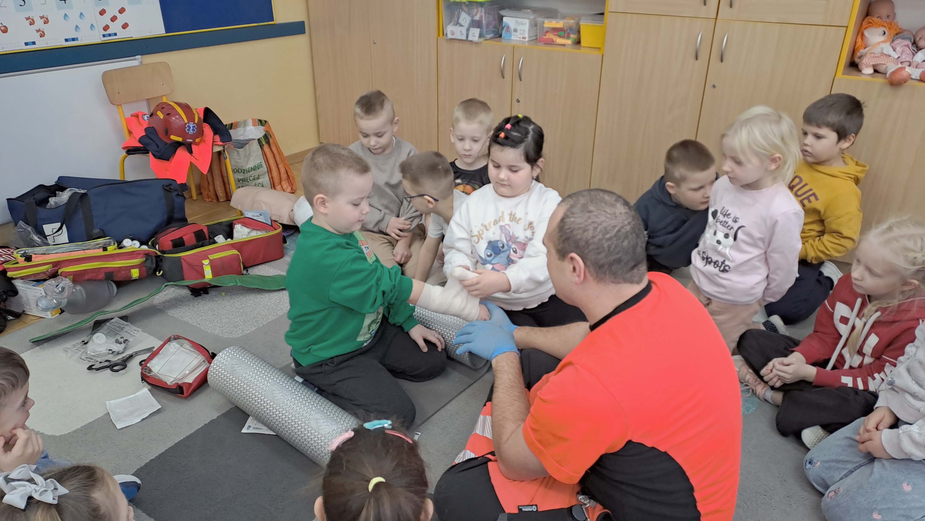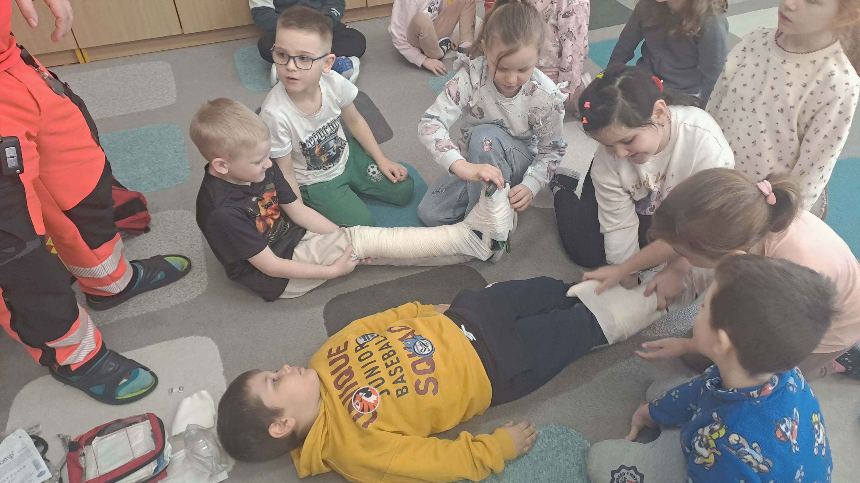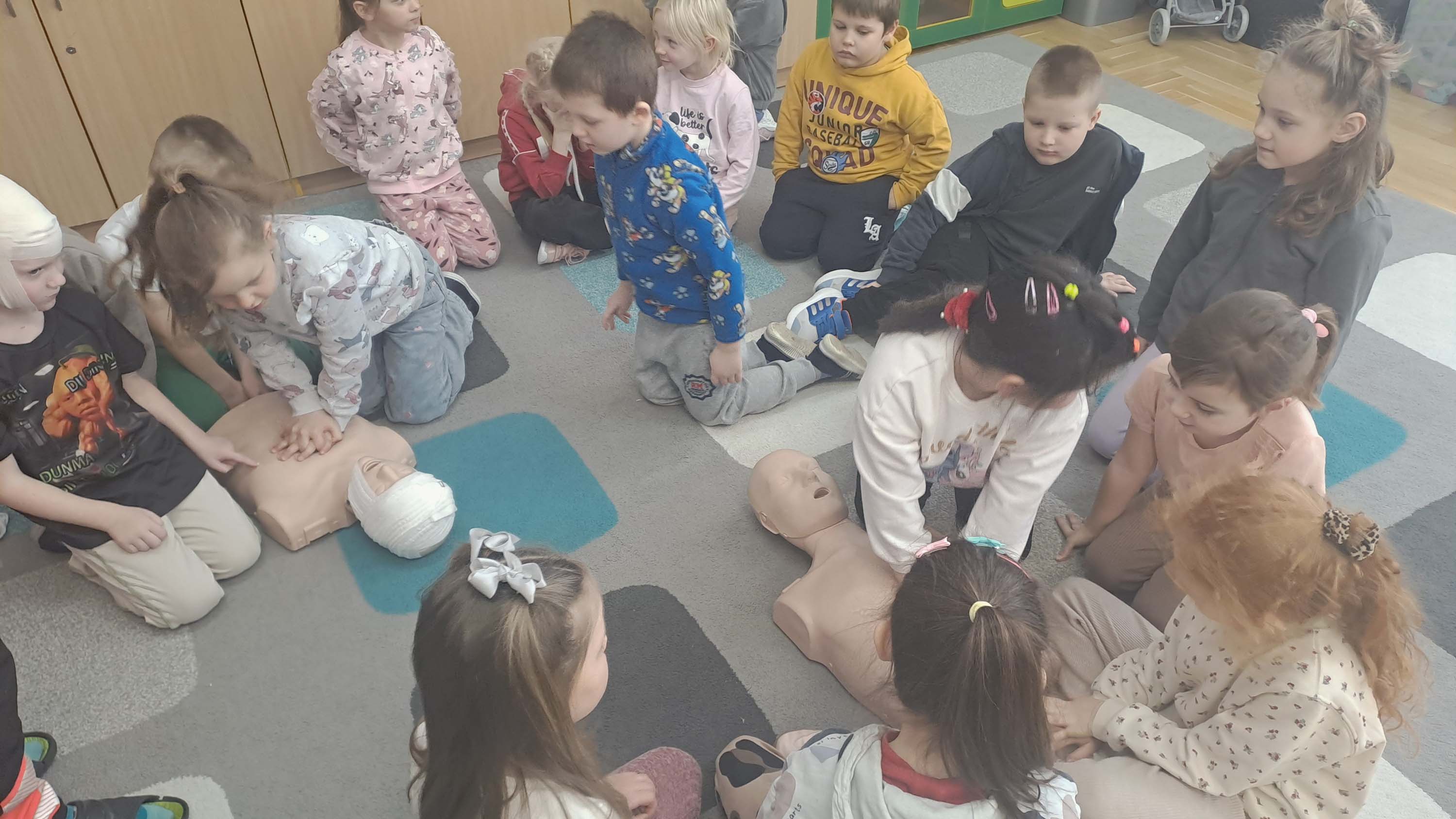 Podczas zajęć dzieci mogły poczuć się jak mali ratownicy. Poznały procedury zachowania się w sytuacjach zagrożenia życia. Wiele emocji wzbudził pokaz czynności z zakresu resuscytacji wykonany na fantomie oraz zakładanie opatrunków na kończyny.