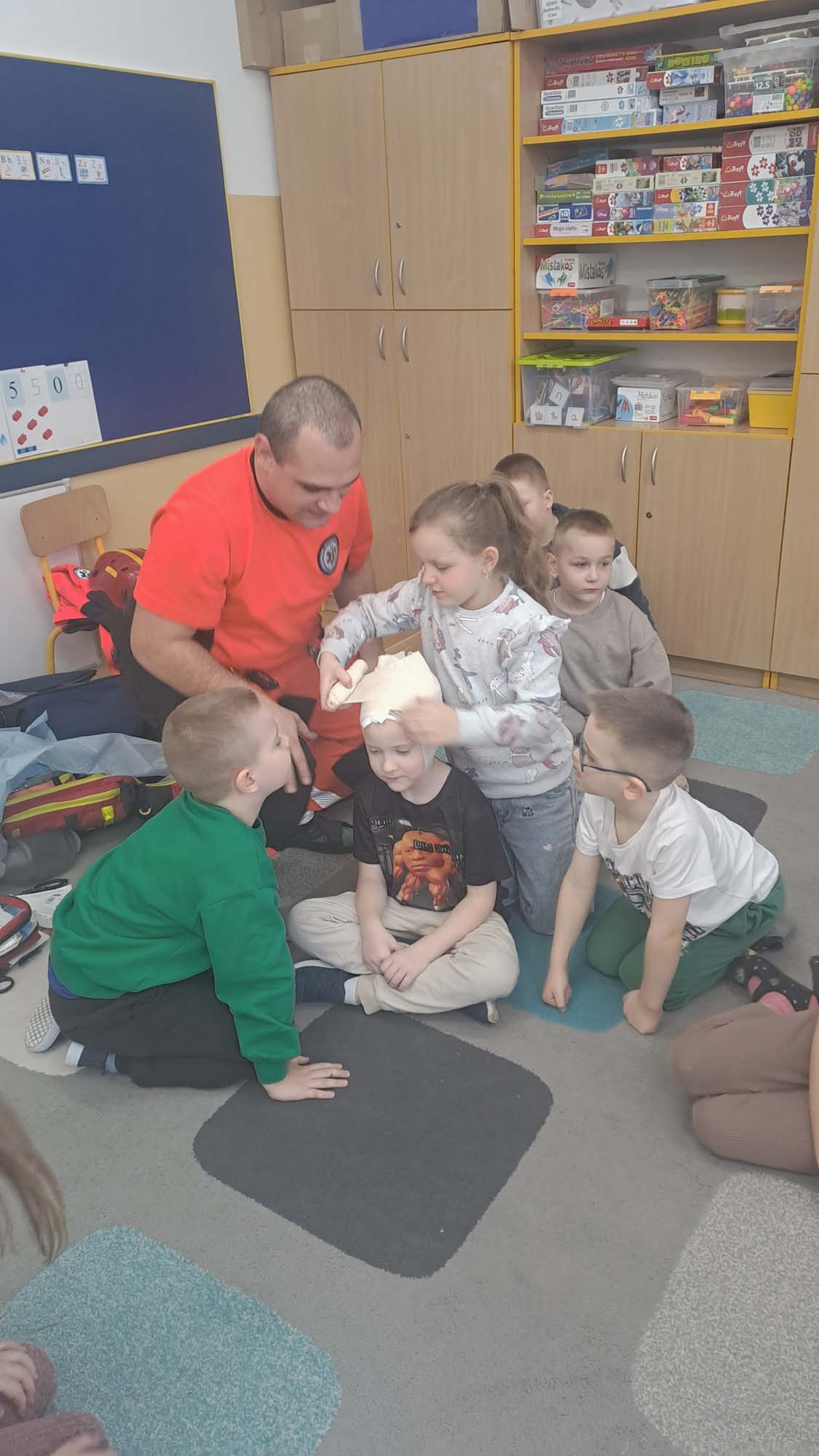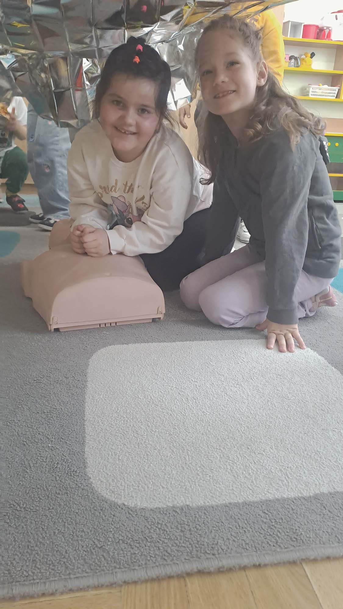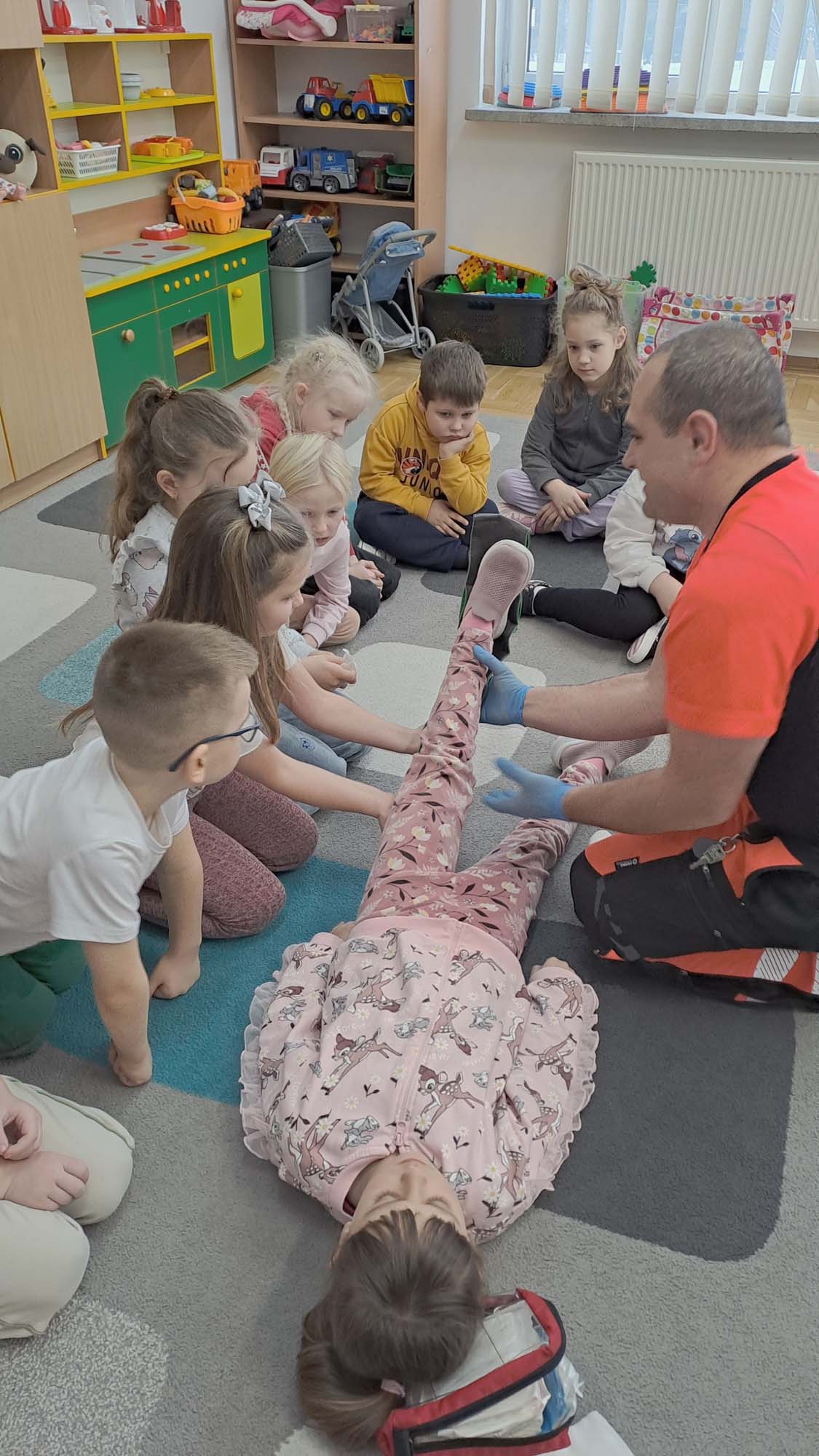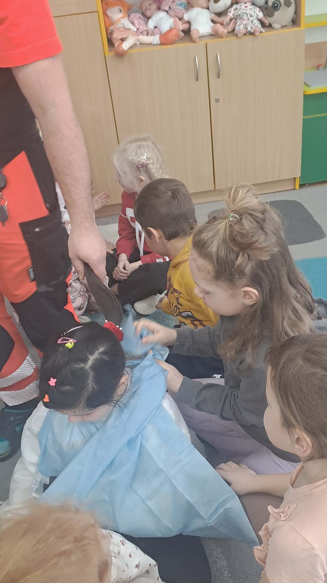 Spotkanie miało na celu kształtowanie pozytywnych i bezpiecznych postaw oraz zapoznanie dzieci z podstawowymi czynnościami ratowniczymi w przypadku nieobecności osób dorosłych. Była to doskonała lekcja – połączenie zabawy z przekazywaniem jakże istotnej wiedzy, która może przynieść nieoceniony efekt – ratowanie życia.